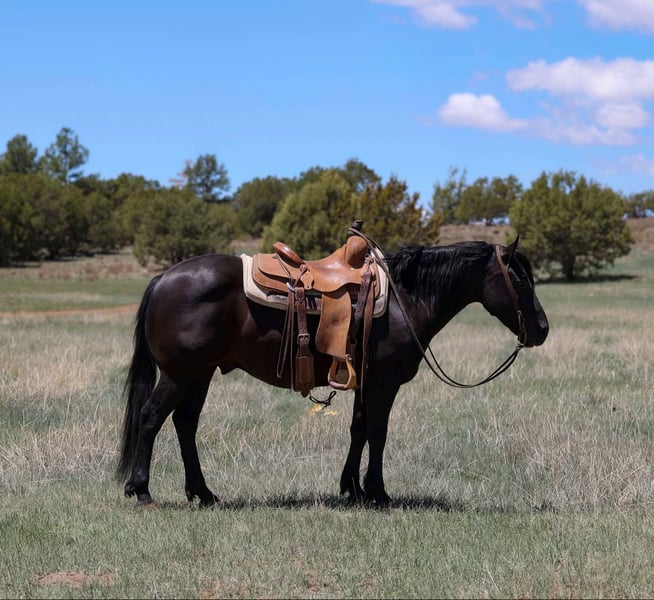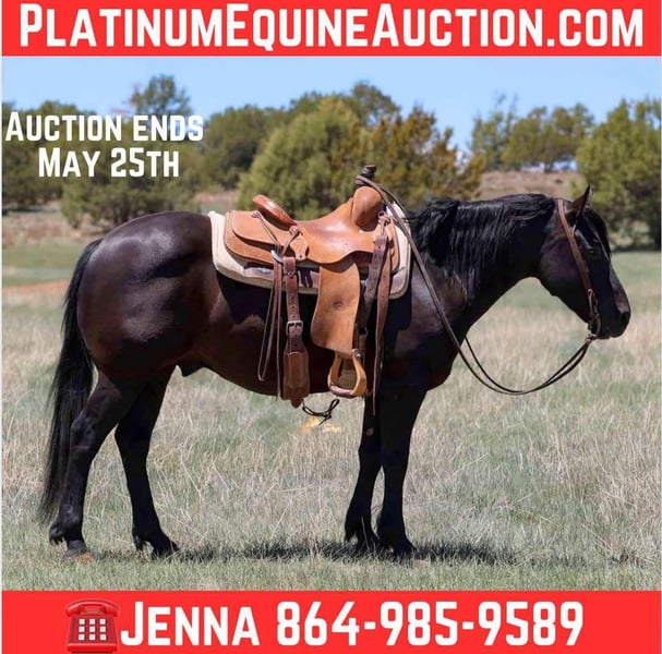 ONLINE AUCTION Place your bids at www.PlatinumEquineAuction.com Starting Bid $3500 Auction ends May 25th, 2025 Need a new saddle? Check out White Rock Saddles on our website or Facebook! Black jack is a 7 year old grade gelding standing 13.3hh. This cute guy has done it all. Black jack has spent countless hours with kids on his back ranching, riding trails, doctoring yearlings, fixing fence, crossing creeks, fallen logs and even in several youth rodeos, ranch rodeos, gymkhanas & 4H shows. This outstanding geldings talent just doesn’t seem to end. He is a show stopper both inside and out of the arena. Black jack walk, trots, & lopes and even side passes like a saint! He is great to bathe, load, shoe, tack, groom, and bridal!! He is a perfect fit for riders of all ages!! Black jack will also come with a clean health and coggins! Call Jenna Edwards 864-985-9589 with any questions. Transport can easily be arranged anywhere in the U.S. from Cottonwood, AZ. ONLINE AUCTION Place your bids at www.PlatinumEquineAuction.com Starting Bid $3500 Auction ends May 25th, 2025 Need a new saddle? Check out White Rock Saddles on our website or Facebook!