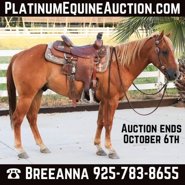 ONLINE AUCTION Place your bids at www.PlatinumEquineAuction.com Starting Bid $3500 Auction ends October 6th, 2024 Need a new saddle? Check out White Rock Saddles on our website or Facebook! Check out Artax: A Versatile and Charismatic Gelding. Meet Artax, a 6-year-old gelding who commands attention with his striking chocolate coat, flaxen mane, and kind eyes. Standing at just over 14hh, he has a compact, athletic build and a charming presence that sets him apart. Artax boasts an abundance of personality, coupled with a curious and adventurous spirit that makes him a joy to be around. He is incredibly intelligent and eager to please, taking to trail courses with ease and confidence. He navigates obstacles such as bridges, tarps, flags, logs, tires, water, and more with poise and grace. This gelding has a superb foundation in his training, with excellent flexion, and precise maneuverability. He’s on the more woah side but will go when asked. He turns around, stops, and backs on command, and moves smoothly through the walk, trot, and lope. Artax is a versatile partner who can excel in a variety of disciplines, from trail riding to working cow horse classes. Artax is a gentleman to handle, loading and hauling quietly, standing tied patiently, and accepting saddling and bridling without fuss. He is well-behaved for farrier care and has a smart, shiny coat that turns heads. He adores attention and bathes, although he does enjoy a good roll afterwards! Located in Valley Springs, CA, Artax is seeking an active partner who will appreciate his talent, personality, and loving nature. Whether you’re looking to dabble in various disciplines or focus on one, Artax has the potential and desire to shine. He should fit just about anyone in your family, bringing them nothing but joy and fun! For more information, please contact Breeanna with Cross B Horses 925-783-8655. ONLINE AUCTION Place your bids at www.PlatinumEquineAuction.com Starting Bid $3500 Auction ends October 6th, 2024 Need a new saddle? Check out White Rock Saddles on our website or Facebook!