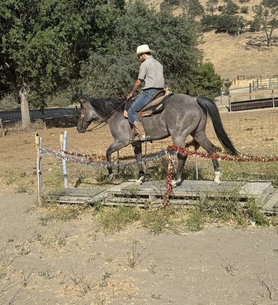 ONLINE AUCTION Place your bids at www.PlatinumEquineAuction.com Starting Bid $3500 Auction ends July 6 2025 Need a new saddle? Check out White Rock Saddles on our website or Facebook! Attention all equine enthusiasts! Allow me to introduce Aqua Man, the magnificent 7-year-old blue roan gelding who will capture your heart with just one ride. Standing proud at a height of 15 hands, this experienced gentleman has mastered countless tasks. Whether it’s branding calves or rounding up livestock, sorting, or any other ranch task, Aqua Man has proven himself to be a faithful ranch hand. On top of that, he boasts exceptional training, with a smooth and elegant collected lope, a seamless sliding stop, and a turn that will surely put a smile on your face. His circles are precise and accurate, and his movements are fluid and effortless. To top it all off, he is a gentle and trusty mount, suitable for riders of any skill level. When out on the trail, he fearlessly tackles any terrain, whether it’s narrow paths, deep waters, or logs to climb over. He navigates with grace and confidence, making him an ideal companion for outdoor adventures. He has happily participated in group treks and has no problem riding solo. He is also acclimated to various obstacles, calmly crossing bridges, cowboy curtains, and tires with ease. Aqua Man is a horse that the entire family can adore, excelling in any discipline. We have taken him down bustling streets, and he has been an absolute champ, willing to do whatever is asked of him. He is also a breeze to handle, catch, clip, and bathe, and he stands patiently for the farrier. He is an absolute delight to be around, and he will undoubtedly be the lifelong partner you have been searching for. If you are interested in meeting this incredible horse, please contact Dina at Longhorn Ranch 831-537-1915, located in Paicines, California. Don’t miss out on your dream horse! ONLINE AUCTION Place your bids at www.PlatinumEquineAuction.com Starting Bid $3500 Auction ends July 6 2025 Need a new saddle? Check out White Rock Saddles on our website or Facebook!