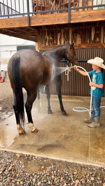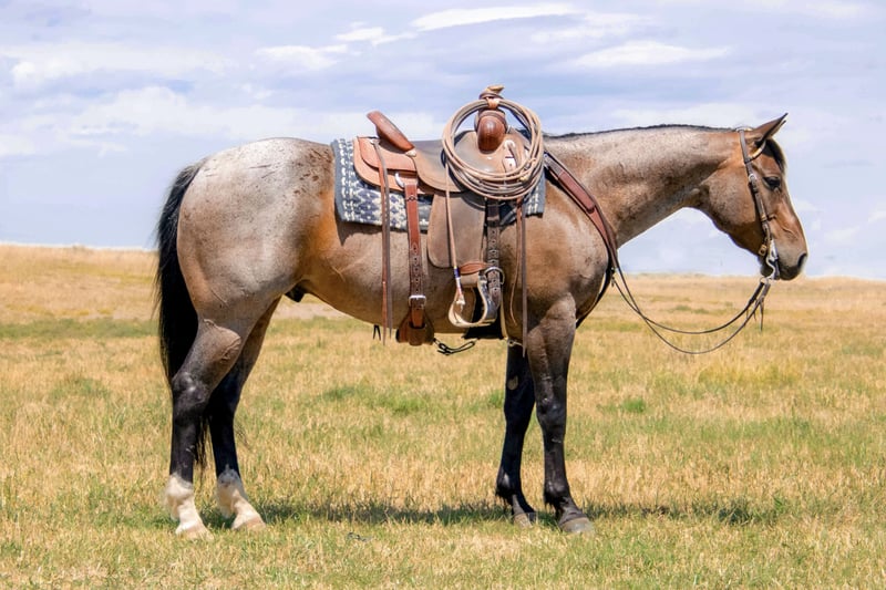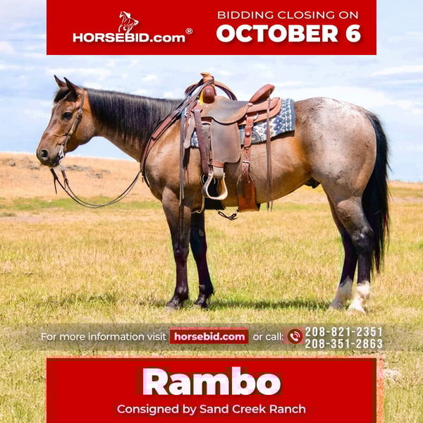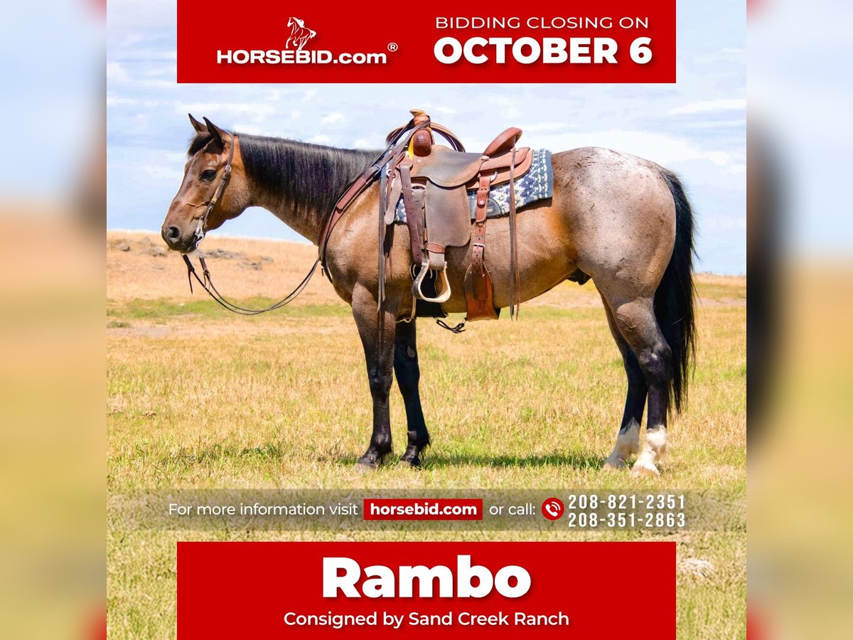 🍂 𝓐𝓾𝓽𝓾𝓶𝓷 𝑨𝑳𝑳 𝑺𝑻𝑨𝑹 𝑳𝑰𝑵𝑬𝑼𝑷 🍂 Happening now thru MONDAY | OCTOBER 6th - Available EXCLUSIVELY on HorseBid's website! For more details and to register visit: www.Horsebid.com CONSIGNOR CONTACT: Sand Creek Ranch 208-821-2351 or 208-351-2863 LOCATION: Saint Anthony ID BREED: Quarter Horse REGISTERED: No COLOR: Bay Roan HEIGHT: 15.1 AGE: 7 GENDER: Gelding Rambo is a pretty 7 year old bay roan gelding. He stands a stout 15.1 hands and is thick made with good bone. Rambo has seen many outside miles and long days rounding up cattle in the high country. He is sure footed when it comes to navigating all different types of terrain. Rambo crosses water, bogs, steep country and downfall with ease. Rambo has done every aspect of ranch work. He has roped and doctored calves, side passes to open gates, sacked out, and everything in between. We have also rode Rambo in the arena, he will pick up his leads, moves his shoulders, ribs, and hind quarters with ease. We have roped out of the box on him. Rambo is cowy, quick and will put you where you need to be on the steer. Rambo doesn’t stay hot after chasing a steer. He will settle down and walk away. I have let my 7 year old ride him around in the arena and track the dummy on him. Rambo took good care of him and slowed down his pace even more for him. I have also let a 86 year old gentleman ride him, Rambo was a gentleman through and through and took care of him. Rambo has literally been rode by everyone. He is sacked out and has gone through our obstacle course which includes a teeter todder bridge, pool noodles and tarp. He’s been around ATVS, cars and semi trucks. Not much phases him. Rambo would make a great trail and mountain horse, ranch horse or an enjoyable pleasure horse. He has never offered to hump or buck even with time off. Any one who is confident and knows the basics can get along with him. Just like with any good ranch gelding he does have some old scars that don’t affect him in any way. He stands quiet at the hitching post but is aware of what is going on around him, he is good to shoe and hot shoe. He bathes and hauls great. This gelding is special and has a big heart. He is willing and always wants to please. Selling with a current PPE. We welcome anyone who would like to see him before he sales to come out to our place and try him out. For more info call or text 208-821-2351 or 208-351-2863.