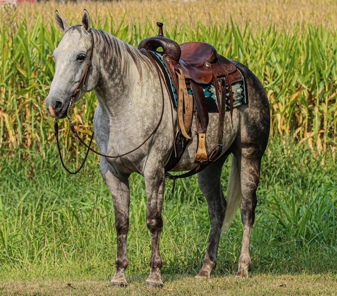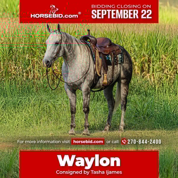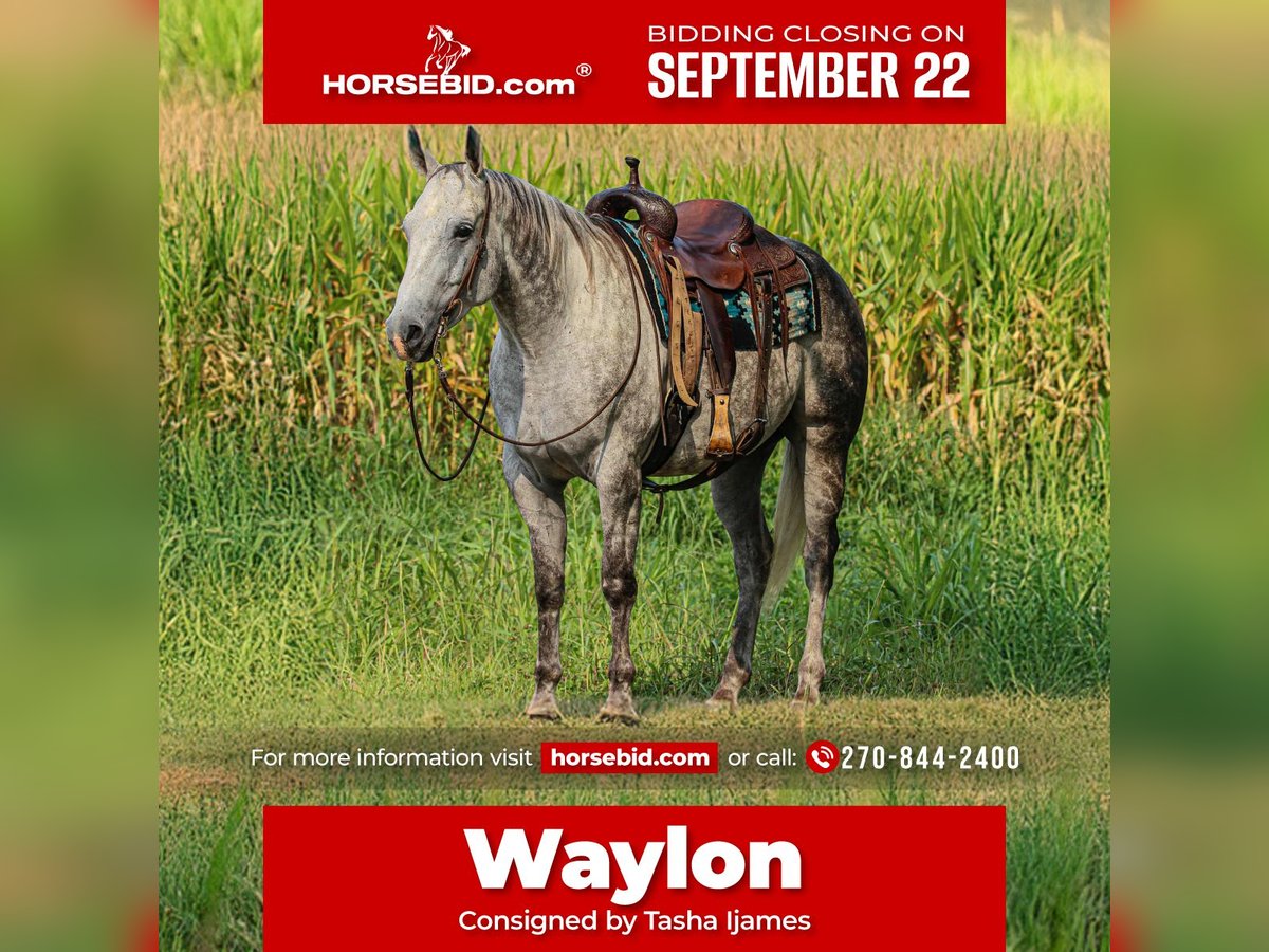 🍁𝒕𝒉𝒆 𝐅𝐀𝐋𝐋 𝑺𝒑𝒆𝒄𝒕𝒂𝒄𝒖𝒍𝒂𝒓🍁 Happening now thru MONDAY | SEPTEMBER 22nd - Available EXCLUSIVELY on HorseBid's website! For more details and to register visit: www.Horsebid.com CONSIGNOR CONTACT: Tasha Ijames 270-844-2400 LOCATION: Henderson,KY BREED: Quarter Horse REGISTERED: No COLOR: Grey HEIGHT: 15.3 AGE: 7 GENDER: Gelding Waylon is a 7yr old grade quarter horse gelding standing at 15.3hh! He is a gorgeous dapple gray, with the sweetest personality! He is a dream to ride! He has the smoothest trot and canter! His walk, is easy and slow making him a great trail horse! He is very forgiving, and a great horse for all levels of riders! He is safe and dependable! Waylon moves nicely and listens to cues well! You can saddle him up and ride off or just hop on him bareback. He is as honest as the day is long and the same horse everytime you take him on a ride! We have taken Waylon to state parks on rides and overnight camping trips! He does great at new places and takes everything in stride! Waylon is great in all types of trail group settings, and will lead the pack or follow! He is remarkably surefooted, you can count on him to pay attention and navigate any terrain you put in front of him. He loves water and will cross creeks, steps over logs and doesn't mind the steep hills! He doesn't mind the traffic, heavy machinery and is used to being around dogs as well! Waylon has also turned back cattle, has been ridden all over the pastures checking yearlings and cow/calf pairs. He has been roping the sled and doing great. He is an all around sweet gelding and so fun to ride! Waylon also rides very well in the arena, he will pick up both leads, he stops and backs up! You can ride him on a lose rein and neck rein or he will direct rein as well! He is a very smart guy and adapts well to new riders! Waylon is one of the sweet and gentlest gelding you will meet! He is very affectionate and is the first to meet you at the gate, and will be a great asset to become a lifetime partner for the family! If you would like to schedule a time to come meet and ride Waylon, or have any other questions about Waylon feel free to reach out to Tasha at 270-844-2400. We are located in Henderson KY and can assist with transportation arrangements. Don’t let this amazing gelding get away from you if you wanting something big, beautiful and dependable.