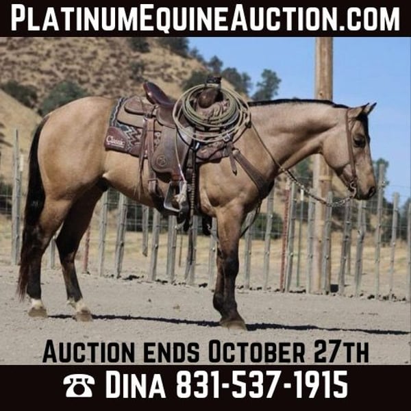 ONLINE AUCTION Place your bids at www.PlatinumEquineAuction.com Starting Bid $3500 Auction ends October 27th, 2024 Need a new saddle? Check out White Rock Saddles on our website or Facebook! Billy The Kid is the epitome of what a horse should be with his trustworthiness and calm demeanor. This beautiful buttermilk buckskin standing 14.2 and 7 years old possesses an exceptional mind, brains, and undeniable style, making him not just a ride but an experience. With his low-headed carriage and impressive stop, he showcases a soft turnaround that speaks volumes about his training. Whether you’re a beginner or an advanced rider, Billy is the safest choice; he effortlessly handles inexperienced riders without ever getting rattled. His ability to pick up leads with grace and execute smooth transitions across all gaits makes each outing feel effortless. On the ranch, he’s been invaluable for gathering and branding cattle all executed with flair that turns heads wherever he goes. Navigating rocky terrain or threading through trees, brush, and deep water poses no challenge for this confident steed; adventure trails are where he truly shines. Even in bustling towns filled with traffic or trains whizzing by, Billy remains un phased a true testament to his relaxed nature. He’s easygoing when it comes to handling rigors like crossing bridges or walking over tarps; these tasks seem second nature to him as if he’s done them countless times before. With impeccable ranch versatility skills that will leave others envious of your partnership together and let’s not forget how smoothly he loads into trailers or stands tied patiently while you prepare for your next journey it’s clear: owning Billy isn’t just having a horse; it’s embracing a lifelong companion who embodies reliability at every turn.Billy is truly safe to be around he clips ties and baths all while remaining calm and comfortable.Billy handles time off well and retains all his training. He pastures well with others and also stalls with ease. Billy enjoys going out on trails with friends or solo he will lead or fallow with confidence and poise. Billy is ready to be your best friend. Please contact Longhorn Ranch Dina 831-537-1915 Located in Paicines, Ca. ONLINE AUCTION Place your bids at www.PlatinumEquineAuction.com Starting Bid $3500 Auction ends October 27th, 2024 Need a new saddle? Check out White Rock Saddles on our website or Facebook!