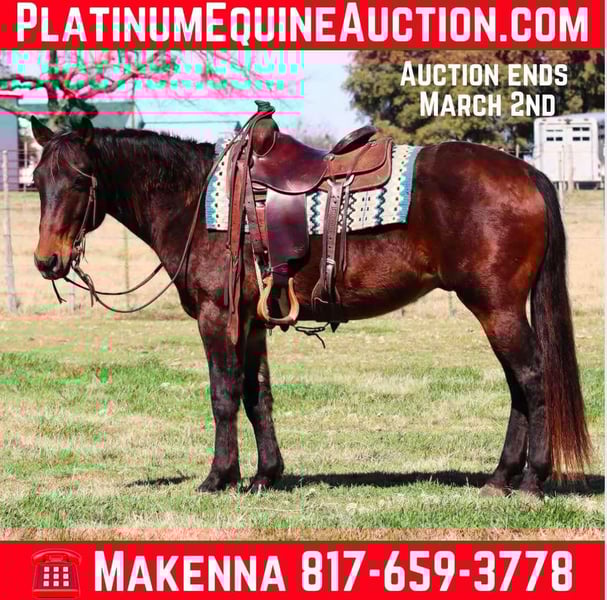 ONLINE AUCTION Place your bids at www.PlatinumEquineAuction.com Starting Bid $3500 Auction ends March 2nd, 2025 Need a new saddle? Check out White Rock Saddles on our website or Facebook! Check out this amazing gelding we have had the opportunity to offer to the public, Booger! At only 8 years old, this 15H gelding is ready to find his forever family! Nothing phases this guy as he is always eager to do is job. This horse not only looks majestic, but he rides like it too. Walk, trot, lope, this horse moves like a dream. The kind of a horse that you can show off to all of your friends. This is the ultimate gift for any family member, as he is gentle and safe for all ages! Booger is well broke, does whatever is asked of him no matter what, he makes it fun! This is the perfect trail horse, as he doesn’t have a care in the world, loves just to go all day with his person. He rides great in the arena, knows both his leads, has a smooth trot as well! I could write a book about him all day but he speaks for himself! Watch his video below, we even spent a day taking Boog through the historic downtown Fort Worth Stockyards! No matter how busy your life may get, Booger is always ready to saddle up and ride off without a care in the world! He will always meet you at the gate, especially with a little cookie interruption. Located in Lipan TX. We can help arrange hauling anywhere in the US, Hawaii or Canada! Please call or text Makenna Hartzell 817-659-3778. ONLINE AUCTION Place your bids at www.PlatinumEquineAuction.com Starting Bid $3500 Auction ends March 2nd, 2025 Need a new saddle? Check out White Rock Saddles on our website or Facebook!