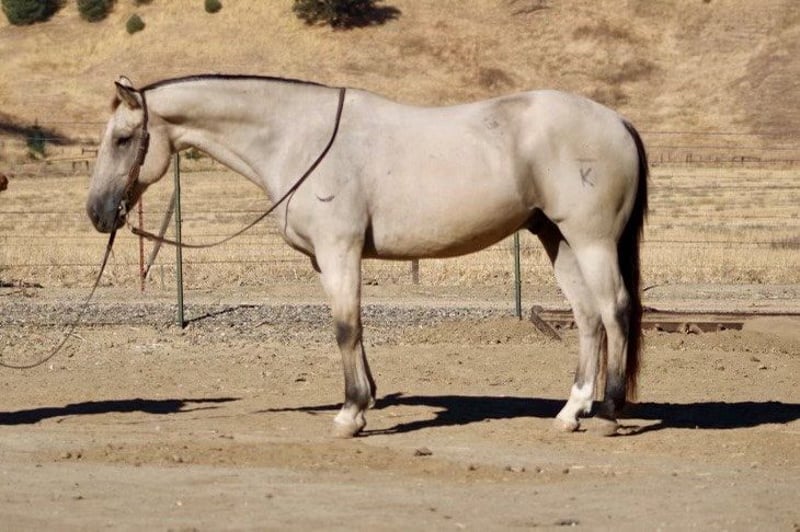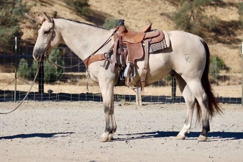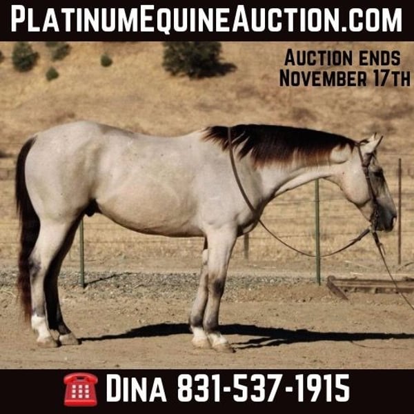 ONLINE AUCTION Place your bids at www.PlatinumEquineAuction.com Starting Bid $3500 Auction ends November 17th, 2024 Need a new saddle? Check out White Rock Saddles on our website or Facebook! Alpine, this beautiful buttermilk buckskin, is truly a standout at 15.1 hands and just seven years old. His striking appearance turns heads wherever he goes, complemented by his friendly demeanor and eagerness to learn. Having been used for gathering cattle ,loading trucks and checking fences. He has been branded on roped outside and is making a super ranch horse. I think he would be a super head horse! Alpine confidently navigates all types of terrain while exhibiting a calm composure.On the trail, whether in groups or solo settings, he displays remarkable versatility; easily crossing creeks and encountering various wildlife without hesitation. Although Alpine hadn’t extensive arena experience prior to arriving here, we are thrilled with the progress he’s made he walks ,trots and canters with poise while picking up leads effortlessly. His nice stop demonstrates both control and responsiveness as he learns new skills like turning around smoothly. Recently tackled obstacles such as tarp bridges and tires were met with ease as he remained unflustered throughout each task. In the pasture, Alpine approaches you willingly at the gate, embodying an easy-going nature that makes him delightful to be around; tacking up is a breeze thanks to his quiet disposition. When it comes to care routines like farrier visits or clipping sessions, Alpine’s calmness shines through again as does his enjoyment during spa days! He thrives either in the company of fellow horses in the pasture or comfortably stalled alone when necessary. Loading into trailers poses no challenge for him; he stands quietly while adapting well to new environments a trait that further enhances his potential as a versatile equine partner. If you are looking for a horse to put your finishing touches on Alpine it the horse for you. I feel like the possibility for this boy are endless make him your trail companion, ranch horse, trail versatility horse or he would make nice rope horse. Alpine is a true gem. Please contact Longhorn Ranch Dina 831-537-1915 located in Paicines, CA. ONLINE AUCTION Place your bids at www.PlatinumEquineAuction.com Starting Bid $3500 Auction ends November 17th, 2024 Need a new saddle? Check out White Rock Saddles on our website or Facebook!