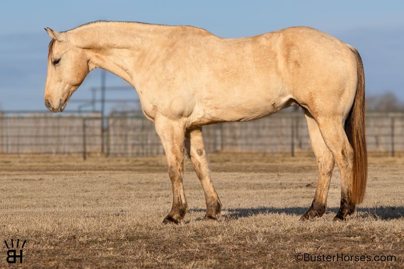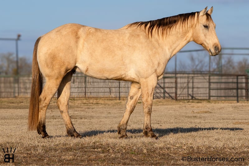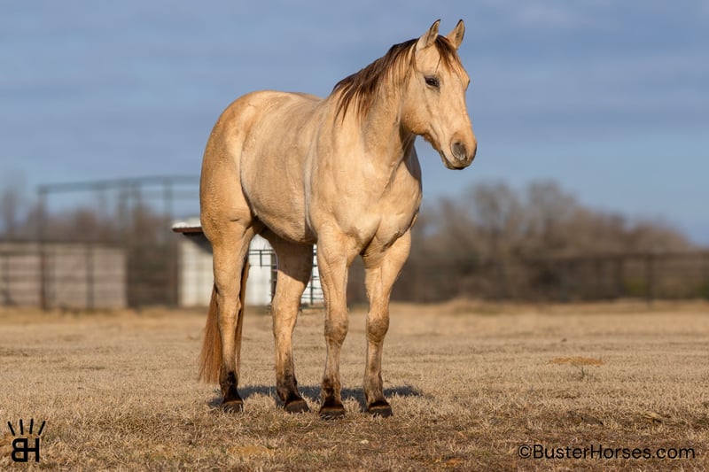 "AVAILABLE ON ONLINE HORSE AUCTION AT www DOT PlatinumEquineAuction DOT com BIDDING OPEN NOW thru SUNDAY | MARCH 1ST! *Final price will be determined on auction site* CONSIGNOR CONTACT INFO: Buster Horses 214-605-7174 LOCATION: Weatherford, TX Arnold is a 9-year-old registered AQHA buckskin gelding that is as thick made and handsome as they come. He spent time on the same Paramount sets as "Mo" (our paramount retired legendary paint gelding who just sold last month). Arnold was selected to work on a couple of different sets, after going through the same type of testing and training required for film work on productions like Yellowstone. Horses don’t make it onto those strings by accident, and Arnold proved himself to be the kind of steady, dependable mount that could be trusted day in and day out around a busy set. Outside of the lights and cameras, Arnold is enjoyable to have around for many jobs and is always easy to get along with. He’s extremely gentle to ride out, very amateur-friendly, and has a smooth, comfortable gait that makes him easy to sit and easy to get along with for a wide range of riders. He’s the kind that you have to pedal to get a trot and Lope out of in the arena, and he's amazing for amateurs to ride outside in the open as he just pitter-patters along and you can just sit there relax and enjoy the ride without having to worry about him getting away from you. He handles himself well in new environments, stays level-headed, and is happy to go about his job without needing a lot of management. Arnold has a great look, a solid mind, and a unique background that sets him apart from your average family, pleasure, or trail riding horse. He’s been exposed to commotion, traffic, and pressure, and has proven himself to be the same consistent individual whether he’s at work or at home. Please check out Buster Horses’ social media pages for additional photos and videos that will be posted leading up to sale day, and don’t hesitate to reach out with any questions. Arnold is located in Weatherford, TX – one hour from Dallas / Fort Worth International Airport. He is an easy day trip, or fun overnight trip to come and try out, from anywhere! We are experienced, knowledgeable sellers, and we can help with quickly arranging affordable shipping to any buyer’s location – we have experience shipping worldwide – including regularly to Hawaii, Canada, Mexico, Europe, and South Africa. Call Ashley with Buster Horses 214-605-7174 MORE pictures and videos at: BusterHorses.com Located in Weatherford, TX ~ West of Fort Worth, TX 1 hour from Dallas / Fort Worth International airport …and we can help with quickly arranging affordable shipping to any buyer’s location ~