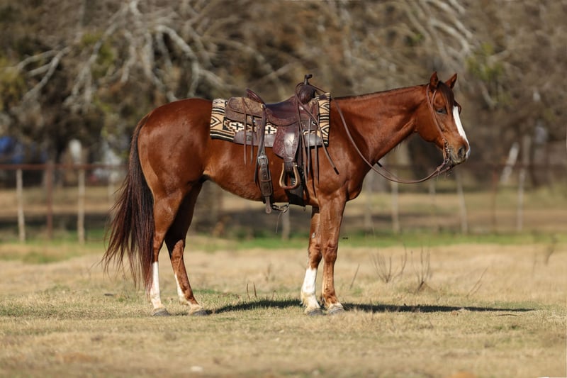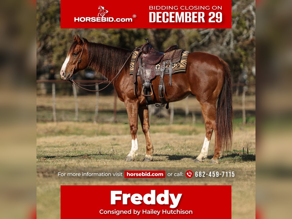 ⚜️ 𝓗𝓮𝓻𝓲𝓽𝓪𝓰𝓮 𝐖𝐢𝐧𝐭𝐞𝐫 𝓒𝓵𝓪𝓼𝓼𝓲𝓬⚜️ Happening now thru MONDAY | DECEMBER 29th - Available EXCLUSIVELY on HorseBid's website! For more details and to register visit: www.Horsebid.com CONSIGNOR CONTACT: Hailey Hutchison 682-459-7115 LOCATION: Joshua, TX BREED: Quarter Horse REGISTERED: Yes REGISTERED NAME: WW LIGHTS OUT COLOR: Chestnut HEIGHT: 15.3 AGE: 8 GENDER: Gelding WW Lights Out aka Freddy stands 15.3 hands tall, handsome chestnut gelding, that will be a perfect addition to the family!🏠♥️ Freddy will steal your heart with his sweet personality, he truly loves people!!! Easy to catch, stands tied, gets along with other horses, and a simple uncomplicated ride for anyone! Puppy dog gentle, kind disposition, and honest every single day. WTL steady circles in the arena, neck reins, picks up both leads, and always aims to please. Freddy has cruised the streets of downtown, and been to the drive thru Christmas light show, and is traffic safe. Enjoys going out on the trails, over logs, and even moving cattle/horses around. Also, rides really well English, and would excel in a lesson program. Goes over ground poles, started over small jumps, and progress every time! Freddy is willing to do whatever is asked of him, while remaining calm and relaxed. He has been ridden by ages from 4 to 54, safe for any level!! If you’re looking for a solid, saintly, and friendly horse, Freddy is your guy!🥰 Currently up to date on coggins, deworming, farrier, and dental. Sells 100% safe and sound! Happy to help arrange shipping to any location!