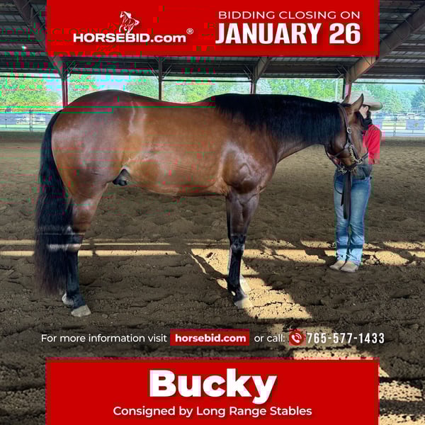 𝐉𝐀𝐍𝐔𝐀𝐑𝐘 ⭐️𝑨𝒍𝒍 𝑺𝒕𝒂𝒓 𝑳𝒊𝒏𝒆𝒖𝒑⭐️ Happening now thru MONDAY | JANUARY 26th - Available EXCLUSIVELY on HorseBid's website! For more details and to register visit: www.Horsebid.com CONSIGNOR CONTACT: Long Range Stables 765-577-1433 LOCATION: Danville, IN BREED: Quarter Horse REGISTERED: Yes REGISTERED NAME: Rhythmic Chip COLOR: Bay HEIGHT: 15.3 AGE: 9 GENDER: Gelding Meet Rhythmic Chip “Bucky,” a 2017 bay gelding who has been a cornerstone of our program since he was a yearling. Bucky started his career trail-riding all over Indiana before entering our lesson and 4-H/Open Show program as a 4-year-old, where he has been successfully shown every year since. He has earned multiple wins across Western and English events and represented at State in both disciplines. Most recently, he competed in Ranch classes at the 2025 NOSHA Worlds, placing multiple times in the Top 5. Bucky is the definition of a well-rounded, all-around gelding. He confidently performs walk, trot, extended trot, and lope; stops, backs, spins, and side passes; and maneuvers over logs, drags logs, and ropes the dummy. Bucky is stalled in the evenings and turned out during the day with nine other horses. He’s easy to catch—we routinely send small kids to bring him in from the pasture. He is best suited for an intermediate rider or for a rider working within a consistent training program where he has a job and stays engaged. Bucky would be an outstanding addition to a Western/ranch show program, a 4-H/Open Show home, or for someone wanting a versatile, broke, and proven partner. He is completely sound and up to date on vaccinations, farrier care (front shoes), and had his teeth floated this spring. Bucky is ready for his next home and next chapter—one where he’ll undoubtedly continue to shine.