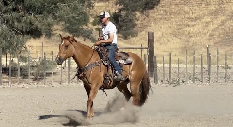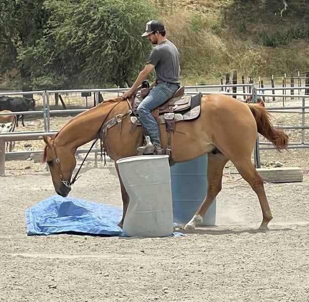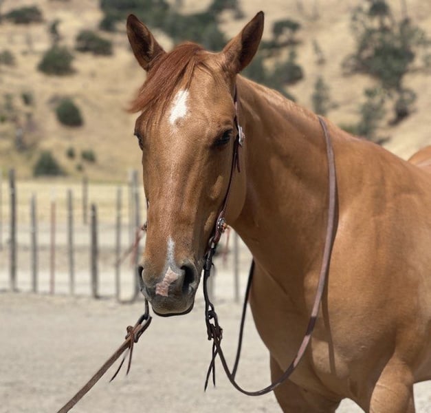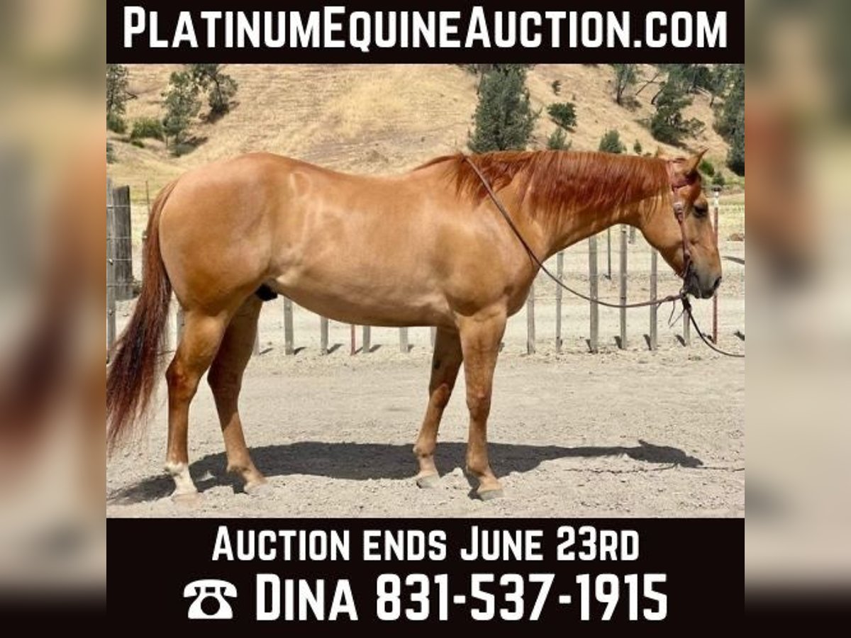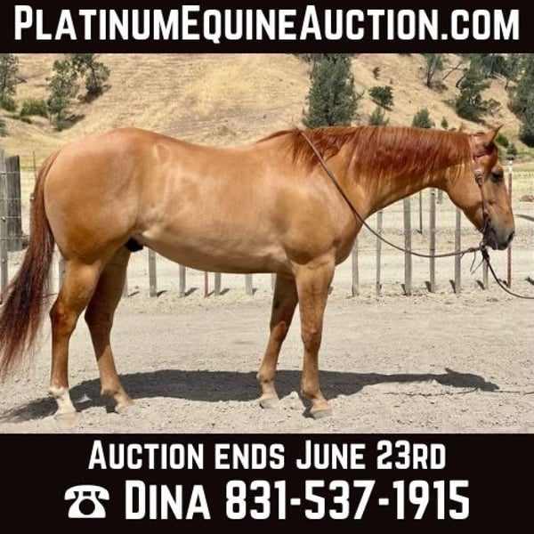 ONLINE AUCTION Place your bids at www.PlatinumEquineAuction.com Starting Bid $3500 Auction ends June 23rd, 2024 Need a new saddle? Check out White Rock Saddles on our website or Facebook! Poco Blessed Trinity is a registered AQHA 2017 model Red Dun gelding with unique tiger striped legs. Poco is a solid 16HH, he is a strong stout made foundation quarter horse. He is super sweet, extremely gentle, and well trained with a loyal temperament. He is one that you can throw the reins to and he will walk low headed anywhere you want to go. He is extraordinarily intelligent, faithful, and obedient. He is calm and relaxed in all circumstances, including new territory and unfamiliar surroundings. He will lope nice circles and has a gorgeous jog that is so comfy. His canter is collected and easy to sit. He has a big stop, he backs up, and moves off of leg cues. He will ride bridleless, bareback and listens to leg cues. He has done some local shows in pleasure and ranch trail classes and he was superb. He will cross all depths of water with confidence and he trail rides out alone courageously without hesitation. He has been to town with heavy traffic surrounding him and is a gentlemen. He is surefooted and picks his way through rocks. Everywhere he goes he catches the attention of everyone with his stunning looks. He’s versatile, extremely safe, true, and sincerely aims to please his rider. He loves attention, comes right up to you, and has the personality of a big ole puppy dog. He is polite, well mannered, and very pleasant to be around. Poco stands for tacking up, and you can mount from either side. He bathes, loads and unloads quietly, and stands tied for any length of time. He is an excellent choice for someone wanting all his great personality traits and the training to make him a top notch horse. Poco is easy to clips. He ties in cross ties and super for the farrier. He has been out to gather cattle, sort pairs, load trucks and is great in the branding pen. He is a great asset to any ranch operation. Poco is one you can put the most timid rider on and he will babysit them. Poco will fit the whole family from the most beginner rider of the family to the most experienced. For more information contact Longhorn Ranch Dina 831-537-1915 Located in Paicines CA. ONLINE AUCTION Place your bids at www.PlatinumEquineAuction.com Starting Bid $3500 Auction ends June 23rd, 2024 Need a new saddle? Check out White Rock Saddles on our website or Facebook!