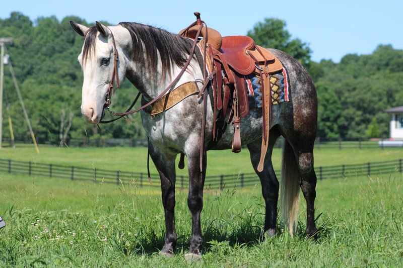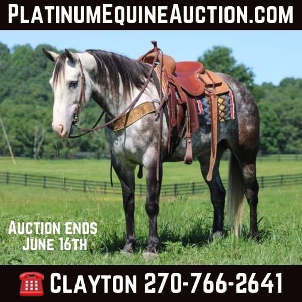 ONLINE AUCTION Place your bids at www.PlatinumEquineAuction.com Starting Bid $3500 Auction ends June 16th, 2024 Need a new saddle? Check out White Rock Saddles on our website or Facebook! Ghost is a 7 year old dapple grey quarter horse gelding! He stands 14.3 hands tall and has the look everyone wants! Ghost has been exposed to about everything you can imagine! He is a very laid back and relaxed horse even in challenging situations! He has been trail ridden tons of miles around mammoth cave national park and will go through water, over logs, and loves to climb hills! He has been ridden by many different levels of riders from experienced all the way to beginners and handles his riders the very best no matter the situation! He has a very nice slow lope, will neck rein, and will back up! He takes his leads in an arena as well as out in the open! He will come over to the mounting block and stand like a statue for mounting! Here is a gelding that will make you a perfect family type horse! He is very easy to catch and handle! If you’re looking for a horse with good size, color, and brains here he is! Don’t miss out on this opportunity! Please CALL Sammy Detweiler 270-218-1073 He is located in Priceville Ky! ONLINE AUCTION Place your bids at www.PlatinumEquineAuction.com Starting Bid $3500 Auction ends June 16th, 2024 Need a new saddle? Check out White Rock Saddles on our website or Facebook!