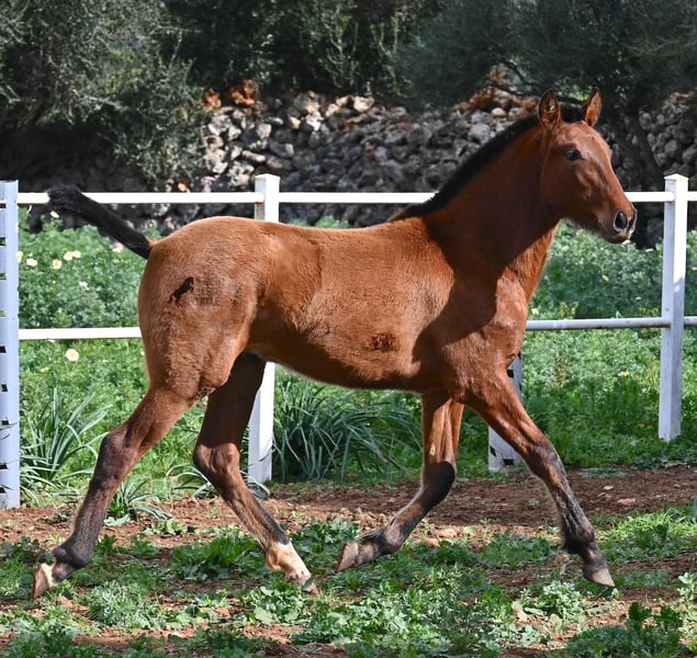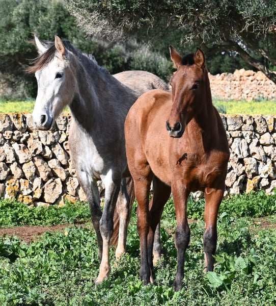 Dit PRE veulen (Andalusiër met ANCCE rascertificaat), geboren in de zomer van 2024, is nu al een echte blikvanger! Hij mag nog bij zijn moeder zijn, maar zal binnenkort gespeend worden en op zoek gaan naar zijn forever home. Hij leeft 24 uur per dag in een robuuste houderij en heeft, dankzij de harde grond van Menorca, echt een goede hoefkwaliteit en is goed aangebonden. Hoewel hij zo'n robuust leven leidt, is hij ongelooflijk knuffelig en zoekt hij meteen vriendelijk contact als je de paddock binnenkomt. Zijn afstamming doet de vrienden van het Spaanse paard meteen sneller kloppen! Van vaderskant is hij SENILLOSA gefokt, met ESCALERA in zijn voorouders. Aan moederszijde is hij een kleinzoon van DARTURO III, die afkomstig is van het ras RETAMALES, en zijn moeder heeft ook PLAZA DE ARMAS en CAMPO BAJO bloed in zich. Deze uitstekende fokkerij selectie is merkbaar in hem, want hij is niet alleen al mooi met een hoofd typisch voor het ras en barokke bouw, maar heeft ook geweldige beweging, die hij goed presenteert ondanks de stenige ondergrond. Een vrolijk, vriendelijk veulen voor een eerlijke prijs voor deze kwaliteit. Zijn vader meet 170 cm en ook hij zal een grotere jongen worden. Hij staat momenteel in Menorca! Video's en stamboom beschikbaar op aanvraag. Ik organiseer graag een AKU ter plaatse, transport of zelfs uw reis, mocht u hem persoonlijk komen bekijken. Details vind je op mijn website of in een gesprek. Saludos uit Spanje