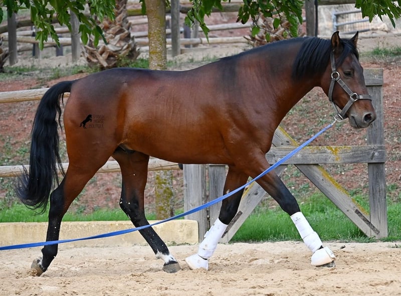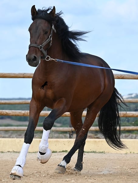 Dieser 2020 geborene, reinrassige PRE Hengst (Andalusier mit Rassenachweis der ANCCE), ist ein richtiges Powerpaket der nur so vor Elan bei der Arbeit strotzt! Er kommt von einem liebevollen Züchter, wo Spätentwickler wie die Spanier, das bekommen, was sie wirklich brauchen- Zeit! So ist er bis 3 in der Hengstherde komplett roh gestanden, wurde dann kurzzeitig aufgestallt, um die Basics zu lernen und dann wieder in den Urlaub entlassen, um alles mit Zeit zu verarbeiten. So hat er aktuell eine gute Basis unter dem Sattel, wo besonders darauf geachtet wird, dass er gut zu differenzieren lernt, zwischen seinem Vorwärtsdrang und Ruhephasen unter dem Reiter. Er lernt immer besser, sich selbst zu tragen, sich zu strecken und Ruhephasen zu verlängern, was sehr schön zu sehen ist. Ein Pferd, dass nicht in der Ausbildung gehetzt wurde, sondern sich erst finden darf und lernt die Energie zu lenken. Und Arbeitswillen hat er ohne Ende! Wo anderen schnell die Puste ausgeht, gibt er mehr und ist unermüdlich, womit er bestimmt ein Ideales Pferd für sehr ambitionierte Reiter ist, die gerne regelmäßig und gezielt trainieren. Geritten wird er auf doppelt gebrochener Wassertrense und ist nur an den Vorderhufen beschlagen. Nachts lebt er auf einem Hengstpaddock, was seinem Kopf auch sehr gut tut und tagsüber ist er in der Box für fürsorgliche Pflege und die korrekte Fütterung ist so besser garantiert. Ausritte auf dem hektargroßen Areal tun ihm auch gut und man merkt richtig, wie er da in seine Mitte findet, als positive Abwechslung zum Viereck. An leichten Arbeitstagen geht er in die Führmaschine und wird auch so weiter bemuskelt, ohne Gewicht zu tragen. In seiner Abstammung finden wir Ausnahmehengste wie YACO de TORRELUNA, ERMITAÑO III und sein Bruder ist sehr erfolgreich in der Dressur und hat es sogar zum SICAB (Weltmeisterschaft der PRE) geschafft. Er hat noch nicht gedeckt und kennt es, in der Nähe von Stuten zu sein, wobei die Option der Kastration vor Ort, selbstverständlich besteht. Aktuell misst er 157cm und hat ein schön barockes Exterieur, mit einem feinen Spanierkopf und guten Bewegungen, die ihn für viele Sparten mit hohem Arbeitsniveau interessant machen. Preiskategorie E-F! Sein Standort ist Menorca. Videos und Abstammung gerne auf Anfrage. Gerne organisiere ich vor Ort eine AKU, Beritt, Kastration, Transport oder auch ihre Reise, sollten Sie persönlich zum Anschauen kommen. Details dazu gerne auf meiner Seite oder im Gespräch. Saludos aus Spanien