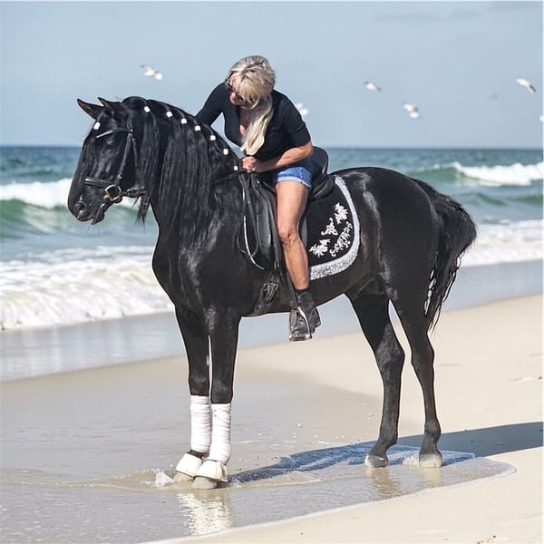 Außergewöhnlich schöner Traum Rappe mit sehr viel Behang, tollen Bewegungen und perfekten Gebäude! Super einfach zu reiten, nervenstark und extrem menschenbezogen! Ein Freund fürs Leben! Röbis und Videos vorhanden!