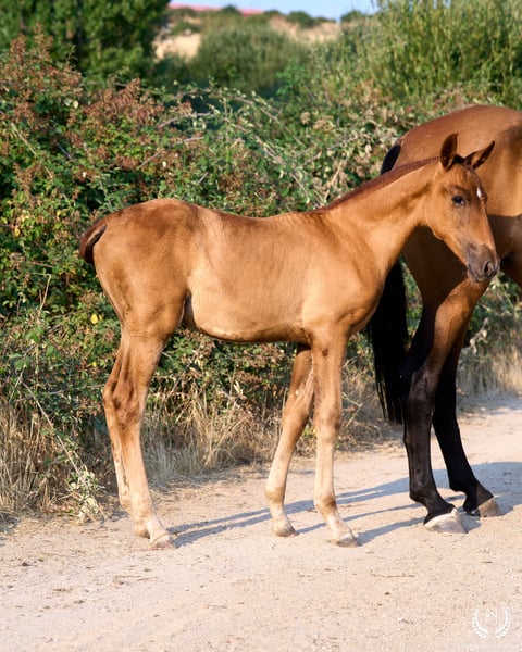 🏇 Ambar is an impressive Pura Raza Española (PRE) filly with a chestnut coat (ee), a white star on her forehead and another on the upper lip, with exceptional genetics. Registered with ANCCE, she is homozygous for the extension gene (ee), the well-known “little e”. Red mane and tail. 📆 Born on 27 May 2025 🧬 Outstanding PRE genetics: ♀️ Dam: Triana CCCXVI, a 1.70 m PRE mare, daughter of the great Deimos (1.80 m) from the prestigious Hnos. Tejedor Fdez. stud. Deimos is a grandson of Educado X (Hnos. Salvador Guardiola Fantoni), a Qualified, Improving and Elite Stallion, one of the most influential names in modern PRE breeding. ♂️ Sire: Pellon – Yeguada Militar “Pellon” is a black stallion born in 2016 at the Military Breeding Centre of Écija, standing 1.64 m tall. He stands out for his beauty, nobility and exceptional willingness to work, qualities he consistently passes on to his offspring. His genetics are impeccable: on the sire line he descends from Velero XI, one of the few stallions recognised by ANCCE as a Qualified Breeding Stallion and Young Recommended Breeder, a reference in sport; on the dam line he descends from Cepellon and Lego, as well as Lebrijano III and Bizarro XIV, some of the most important reproducers of the Yeguada Militar. Pellon has over 58 registered offspring, consistently producing elegant, functional and very expressive foals with top-level morphology and temperament. 🏆 Sporting potential and exceptional genetics: Ambar has everything to become an outstanding filly: impeccable breed morphology, convex profile and head, wide, functional and powerful movements, an exotic and highly valued coat, and a sweet, very easy temperament. Her pedigree guarantees quality and a strong future. 🩺 Health guaranteed: Any veterinary examination is accepted. Filly raised in freedom, perfectly socialised and well balanced within the herd. ✈️ National and international transport: We work with the best specialised equine transport companies. Request your quotation with no obligation.