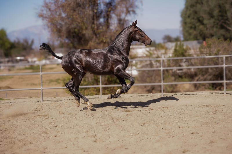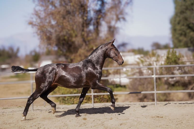 VIOLETA CAS (2024) – Black Filly | Purebred P.R.E. Sired by the exceptional SF Heredero XI and out of Holgazana VG, Violeta CAS carries some of the most respected and proven Spanish bloodlines in modern breeding. Her sire, SF Heredero XI, is a direct son of Generoso XXXIII, known for producing offspring with remarkable expression, strong toplines, and balanced movement. On her dam’s side, Holgazana VG brings the powerful influence of Incauto CEN, a grey stallion descending from Delgado MAC, and the renowned blood of Gavilan XXIX, a consistent producer of type, cadence, and temperament. This maternal line adds versatility, excellent conformation, and a classic Spanish presence. Violeta CAS represents an ideal blend of beauty, intelligence, and movement, with a genetic foundation proven in both functional and show disciplines. Her pedigree traces to champions such as Lebrijano III, Elegido XXIII, and Nevado IX, ensuring she carries forwardlines that have defined the Pura Raza Española for generations. Whether destined for the show ring, breeding program, or classical training, Violeta CAS offers extraordinary potential with the elegance and strength that define the true Spanish horse.