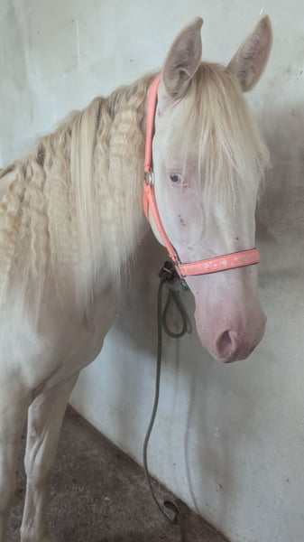 Dubai ist eine bildhübsche, fast schon elfenartige junge Perlino Stute. Sie besticht nicht nur durch ihre Optik, sondern auch durch ihre Coolness , ihre Gelassenheit und durch ihr liebenswürdiges Wesen. Sie steht aktuell im Offenstall, ist super verträglich und ist eher rangniedrig. Im Alltag ist sie absolut unkompliziert und macht alles brav mit, auch beim Schmied ist sie anständig. Sie wird aktuell aufs reiten vorbereitet und macht auch dies souverän mit. Eventuell könnte sie auch noch zum arbeiten bleiben, aber es würde ihr auch definitiv nicht schaden , nochmal über den Winter damit zu warten, da sie sich doch noch im Wachstum befindet. Ich denke so 158/160 könnte sie noch erreichen. Wer ein schickes , mega gelassenes Jungpferd sucht, welches für jegliche Sparten der Reiterei offen ist , ist bei Dubai genau richtig. Auch als zukünftiges Therapiepferd könnte ich sie mir sehr gut vorstellen. Wir trennen und nur von ihr, da sie nicht aufgenommen hat, und wir unbedingt nächstes Jahr ein Fohlen von ihr haben wollten , bevor unser Hengst verkauft wird.