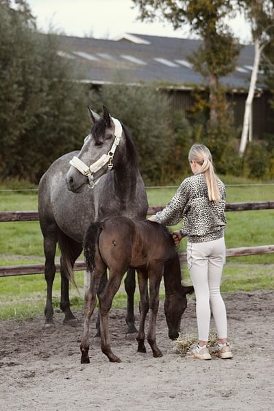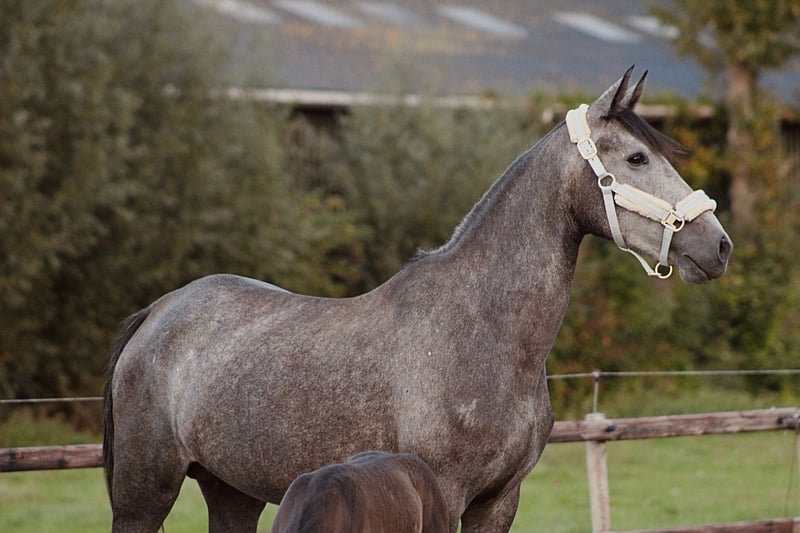 Super cute and sweet 4-year-old grey Andalusian mare, approximately 1.56 m tall, together with her stunning black crossbred Friesian foal. Nubia is a loving and caring mother, she moves very well and has beautiful, flowing gaits. Gentle and friendly in handling, she is now able to stand quietly at the wash station and is easy to groom, touch, and lead on walks. Nubia is ready to continue working with her new owner to build a strong bond and a bright future together. A fantastic opportunity for someone who wants to train their own horse with good character and attractive looks. A very nice horse to start working with and to shape according to your own preferences. Her gorgeous foal, named Zorro, who is now 1.5 months old, is included in the sale. Zorro is a very handsome, super easy-going, large black colt, sired by a Friesian. He is beautifully built with an elegant frame and moves exceptionally well, making him a real eye-catcher. A good home for both is essential! Traffic-safe, trailer-trained, and free of any defects. Stop searching, come quickly to see and fall in love with this wonderful pair! Transport can be arranged. If you cannot reach us, please send a WhatsApp message or email. For more information or to make an appointment, you can WhatsApp or call: +31 6 23 25 41 13.