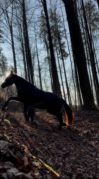 Da wir aus privaten Gründen unsere Pferdehaltung aufgeben müssen sind zwei Pferde zu Verkauf. Das hier ist Freya. Eine bald 5-jährige Spanier Mix Stute. Sie ist ca. 158 cm groß. Freya wurde im vergangenen Jahr schonend angeritten und zeigt sich sehr gut unterm Sattel. Ihre drei Grundgangarten sind alle so als würde man auf einer Wolke schweben. Sie ist super bequem und angenehm zu sitzen und hat schon einen außergewöhnlich gesetzten Galopp für ihren Ausbildungsstand. Freya ist ein sehr feines und gelehriges vielseitig gearbeitetes Pferd. Wir machen viel Bodenarbeit, Freiarbeit, Handarbeit, Doppellonge usw. Sie kann vom Boden und unterm Sattel die meisten Seitengänge. Freya ist ein sehr aufgeschlossenes, mutiges und neugieriges Pferd. Sie ist absolut menschenbezogen und verschmust. Sie kann auch schön einparken und spanischen Schritt. Im Gelände lässt sie sich super in allen drei Grundgangarten reiten. Sie geht auch brav und ruhig durchs Unterholz. Freya läuft als Handpferd und man kann sie auch schön mit Handpferd reiten. Auch im Galopp und quer durch den Wald macht sie das sehr unkompliziert. Da ich zu viele Pferde zu bewegen habe, gehe ich nie alleine mit einem Pferd raus. Deswegen wurde Freya noch nicht alleine ausgeritten. Alleine spazieren kennt sie aber und das alleine ausreiten klappt bestimmt auch, wenn sie sich gut mit dem neuen Besitzer zusammengewöhnt hat. Freya ist ein Pferd mit gutem Temperament. Sie ist ausgeglichen und ruhig, aber sehr leistungswillig. Wir suchen ein Zuhause für sie, in dem sie regelmäßig und abwechslungsreich bewegt wird. Freya ist robust und gesund. Die Zähne sind frisch gemacht und sie läuft barhuf oder mit Hufschuhen. Ihre Hufe haben sehr gute Qualität. Geimpft ist sie natürlich auch. Sie steht im Offenstall in einer gemischten Herde. Verladen klappt auch gut. Wir suchen ein Zuhause mit pferdegerechter Haltung und wertschätzenden Besitzern. Wetterbedingt kann auf unserem kleinen Reitplatz aktuell leider nicht geritten werden. Freya kann gerne in der Bodenarbeit und beim Ausreiten getestet werden. Wir nehmen uns ausführlich Zeit für dich zum Kennenlernen. Fürs Probereiten einer Person verlangen wir 40€. Das wird beim Kauf erstattet. Als Zubehör kann ein Westernsattel (Diamond / 1.000€) oder Springsattel (Prestige / 2.000€) erworben werden. Es kann auch der Rest der Ausrüstung für 300€ übernommen werden. Melde dich gerne, wenn du an diesem besonderen Pferd Interesse hast. Tel: 0152-24429139 Freya beim freien Einparken (scrolle gerne durch mein Profil für mehr Videos von Freya) https://www.instagram.com/reel/DN5pIOCDSdm/?igsh=bmxqd202NWllNWox