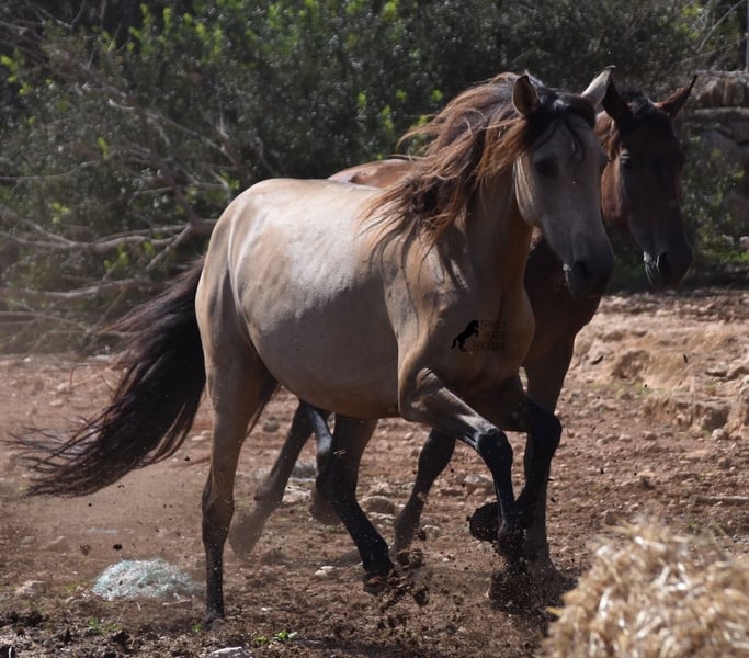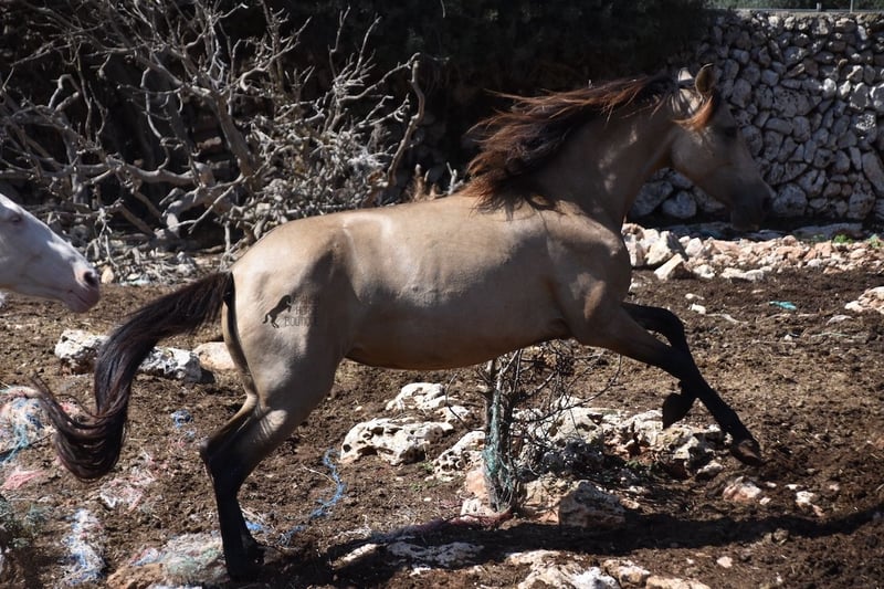 Born in 2019, this dun mare is a real raw jewel. Translated, the golden child's name means "chamomile" and she also has a very calming charisma. Although she is completely raw, she opens up within a few minutes and enjoys being cuddled and handled. She then follows you even when the herd moves in a different direction. With this people-friendly, open character, it will certainly be easy to break her in. Of course, there is also the option of organizing a ride on site. As it had rained heavily the day before, the ground was a little slippery, but she still moved beautifully and went over the rocks in the paddock like a chamois. In the herd, she is of medium to low rank and due to the 24-hour robustness, she is well socialized, resistant and well tied up, thanks to the stony ground. I estimate her final height to be 157cm, as it was not possible to measure her freely. She is currently in Mallorca! Videos and photos of the equine passport are available on request. I would be happy to organize an AKU, riding, transport or even your trip if you come to see her in person. Details can be found on my website or in conversation. Location