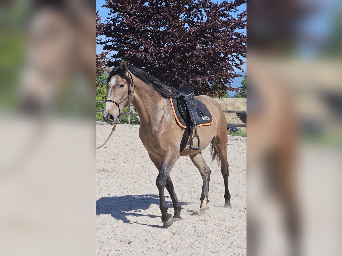 Mein Name ist Khan, geboren am 10.6.23. Meine Eltern: Serenata PRE Stute mit NCCE Papieren, Rifai Berber -Araber Hengst mit OMCB Papieren. Ich bin schön gewachsen, (noch im Wachstum), Stockmass 1.56. Am 8.April 2026 wurde ich gelegt. Meine Ausbildung ist im vollen Gang. Ich kenne das Fohlen ABC, lasse mich gut führen und kenne das Longieren. Ich werde sorgfältig ans Anreiten herangeführt: Sattel, Satteldecke und Sattelgurt bereiten mir keine Probleme. Meine Ausbilderin hat mir auch das Gefühl, ein Bein auf dem Rücken zu haben, vermittelt. Demnächst werde ich wohl auch schon angeritten. Ich kenne den Peitschenbefehl zum Parkieren an die Aufstiegshilfe, kann sogar auf Pfiff parkieren und bleibe ruhig stehen. Das Einsteigen in den Trailer kenne ich, muss es aber noch perfektionieren. Ich habe auf dem Hof und beim Spazieren mit meinem Besitzer schon etliche Maschinen und allerhand Fahrzeuge kennengelernt und lasse mich nicht so schnell aus der Ruhe bringen. Ich bin ein tolles, liebenswertes, temperamentvolles, menschenbezogenes, neugieriges und elegantes Pferd; ein idealer Freizeitpartner! Am liebsten möchte ich in einem Offenstall leben… Gegenwärtig stehe ich noch auf der Hengstfohlenweide nahe Bern. Mein Besitzer, Georg Spörri 077 415 77 48 oder hgspoerri@proton.me macht gerne einen Besichtigungstermin mit Dir aus.