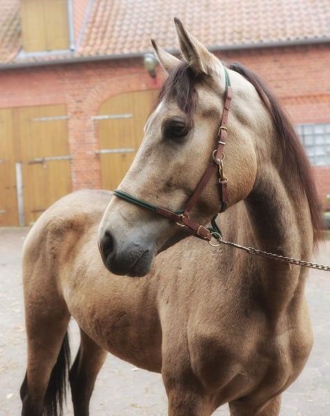 Soms ontmoet je een paard dat gewoon alles heeft – die bijzondere uitstraling, dat liefdevolle karakter en dat beetje extra dat je meteen raakt. Zo is deze jonge Iberische ruin, een prachtige mix van Lusitano en Spaans bloed, nog maar 3 jaar oud en nu al een echte blikvanger! Zijn speciale kleur buckskin glanst in het zonlicht, en zijn snoezige gezichtje doet iedereen smelten. Met een huidige stokmaat van 1,57 m groeit hij nog een beetje en toont zich altijd vriendelijk, nieuwsgierig en mensgericht. Hij is gezond, helder van geest en klaar om de wereld te verkennen – of het nu als toekomstige rijpartner, recreatiepaard of dressuurtalent is. Een paard dat niet alleen mooi is, maar met zijn karakter echt in het hart raakt. 💛 Eenvoudig bekijken – en verliefd worden.