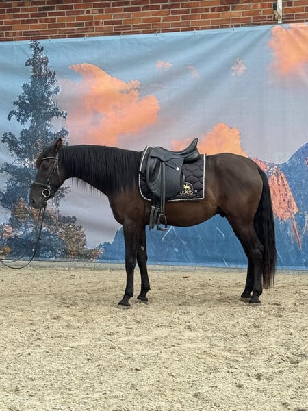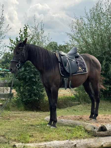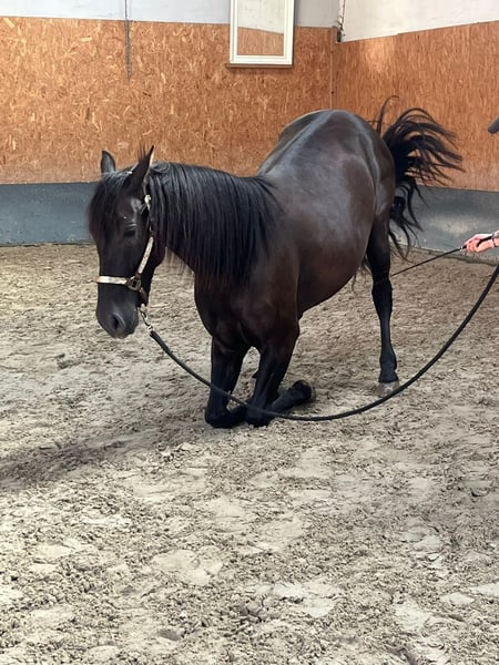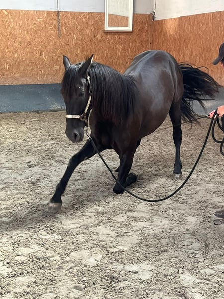 This stunning, jet-black Andalusian gelding was born in 2021 and currently measures approximately 16.0 hh. He impresses with his correct conformation, elegant appearance, and, most notably, his exceptionally sweet temperament. He is very affectionate, friendly, playful, and open-minded towards people. Despite his young age, he is already remarkably calm in handling and always well-behaved—whether at the vet or the farrier. He has been regularly dewormed and vaccinated, holds a passport, and is familiar with various types of stabling, including box stabling with turnout and herd life. He is still developing age-appropriately but has already been lightly and patiently backed through playful groundwork. Under saddle, he is eager to learn, attentive, and versatile. He has gained initial experience in the field and on the road, which he handled confidently. Additionally, groundwork and classical dressage exercises, such as the compliment, have been introduced; he already performs this well. The rein-back is currently being developed, and he has been gently introduced to piaffe. This young gelding has all the qualities to develop into a reliable partner. He is especially suitable for riders who enjoy patiently and sensitively furthering a young horse's education and growing together.
