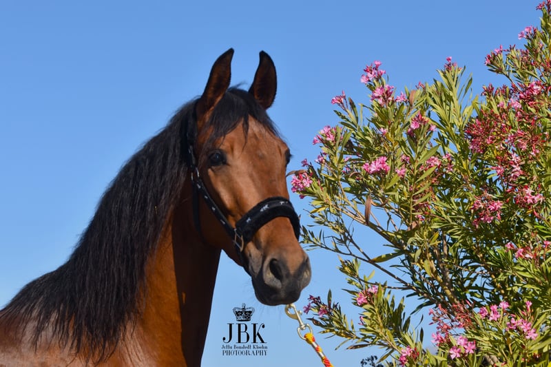 Andalusische ruin Pegaso werd op 11-12-2018 geboren en is 1,57 m groot. Zijn vader is de Hispano-Arabische ruin Cucharin, die in mijn stal staat. De moeder was een PRE-merrie, maar niet gekeurd. Pegaso is bekend met het werken met kinderen in het schoolbedrijf en is super braaf, omdat hij uitstekend is opgeleid en ook vandaag de dag als een klok al het werk dat hem wordt opgedragen zonder problemen uitvoert. Hij beweegt heel mooi en is super gemakkelijk te hanteren. Zijn karakter is een 1 met een ster!!! Even lief als zijn vader.