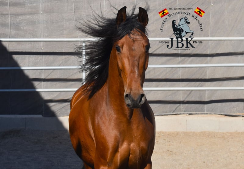 Il cavallo Andaluso castrato Pegaso è nato l'11.12.2018 ed è alto 1,57 m. Suo padre è il cavallo Hispano Arabo Cucharin, che si trova nel mio maneggio. La madre era una fattrice PRE, ma non è stata approvata. Pegaso ha esperienza nel lavoro con i bambini nell'attività scolastica ed è molto ben educato, poiché è stato addestrato in modo eccellente e ancora oggi svolge senza problemi tutti i compiti che gli vengono assegnati. Si muove molto bene ed è super facile da gestire. Il suo carattere è un 1 con lode!!! È altrettanto affettuoso come suo padre.