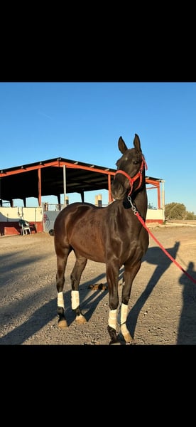 Caballo cruzado padre lusitano madre Anglo árabe. Hace espaldas adentro, cesiones a la pierna, apoyos y piruetas, está empezando con los cambios de pie. Sale al campo y a romerías
