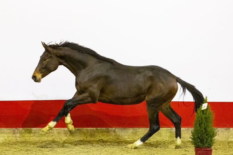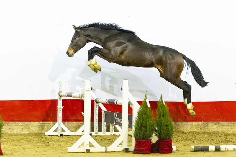 Falco immediately stands out for his way of moving and jumping. He shows an excellent trot and canter and has a big, ground-covering canter. Over the jump he shows plenty of scope, judges the fence with calmness and overview and jumps with good technique. This natural overview will later help the rider to find correct distances more easily in the course. His beautiful dark colour makes him a real eye-catcher, both now and for the future. A young horse that inspires confidence and shows clear promise. Sire Forino, by For Pleasure, competed himself up to 1.45 m level, including international young horse classes. Grandsire For Pleasure competed at 1.60 m Grand Prix level and is one of the most influential sires in modern showjumping, known for passing on mentality, reflexes and rideability. The damline is very strong. Dam Falla, by Cormint, competed at 1.20 m level and descends from a family full of international sport horses. The damline includes Cassino at 1.45 m, Biqueen at 1.40 m, Cesaria TT at 1.40 m, Calimbo 10 at 1.40 m and Catwalk van de Helle, who competed at 1.60 m Grand Prix level. The line also produced approved stallions, confirming its reliability for sport and breeding Falco brings together a big canter, scope and natural overview with a proven performance pedigree, making him a very interesting prospect for the future.