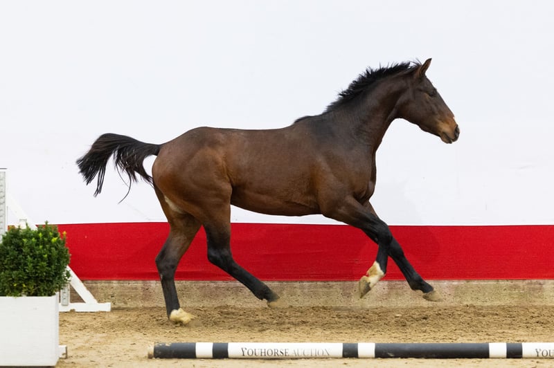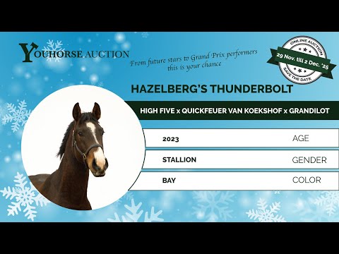 De tweejarige Hazelberg’s Thunderbolt is een mooie donkerbruine met goede bewegingen. Hij springt met macht en voorzichtigheid. Vader High Five is een achtjarige AES-goedgekeurde hengst van Casall uit de befaamde 1.60m Grand Prix-merrie Pialotta, gereden door Rolf-Göran Bengtsson en Edwina Tops-Alexander. Moeder Krista Belle D (Quickfeuer van Koekshof) is een halfzus van Harley D (1.55m Grand Prix met Vasco Flores en Coco Fath), Fandilot D (1.50m springen met Niklaus Rutschi) en twee 1.30m springpaarden.