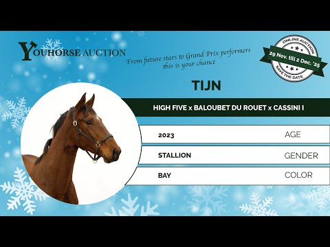 De tweejarige Tijn is een mooi gemodelleerd, sterk paard met een goede afdruk bij het springen en vermogen. Zij negenjarige halfbroer MacKenzie springt internationaal 1.45m met Andrea Ciancico uit Italië. Vader High Five is een achtjarige AES-goedgekeurde hengst van Casall uit de befaamde 1.60m Grand Prix-merrie Pialotta, gereden door Rolf-Göran Bengtsson en Edwina Tops-Alexander. Moeder Eunited (1.10m springen) stamt af van de bekende Baloubet du Rouet en is ee volle zus van United M (1.50m springen met Robert Mendoza) en de hengst It’s Young Baloubet R.T. (1.40m springen met Said Saad). Grootmoeder United II (Cassini I x Quidam de Revel) gaf ook Joie de Vigo R.T. (1.55m Grand Prix met Sofia Westborg) en is zelf een halfzus van Nontender (1.50m springen).