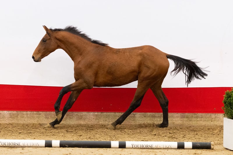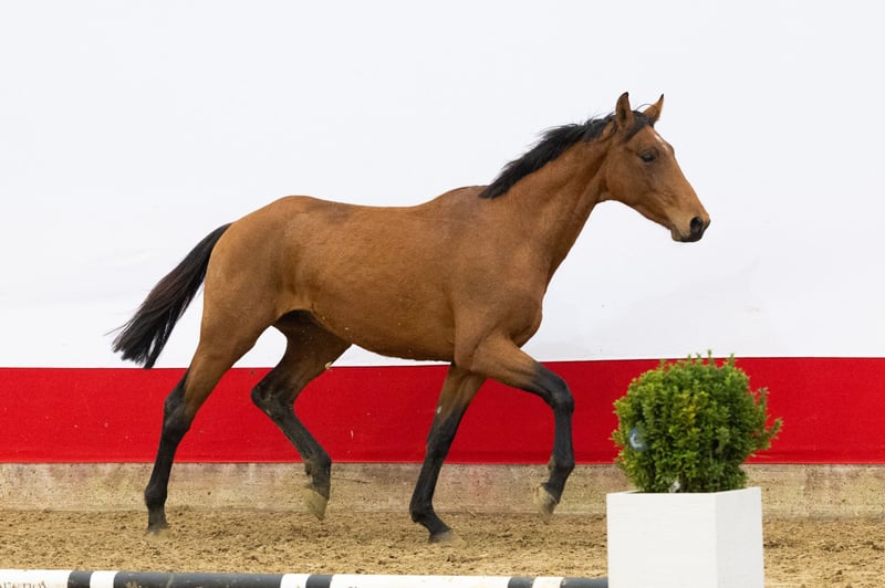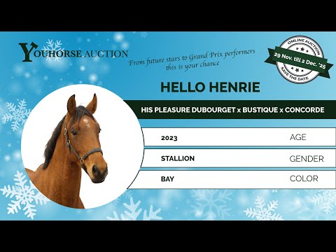 Wat een prachtig type en check zijn goede techniek van springen. De tweejarige Hello Henrie wil voorzichtig zijn en kan goed bewegen. Zijn zevenjarige halfzus Vorselina springt op 1.30m niveau. Zijn volle broer Veldstar is eveneens te koop in deze veiling. Vader is de 8-jarige AES-hengst His Pleasure Duborget, halfbroer van drie 1.50m en vijf 1.40-1.45m springpaarden en gefokt uit de halfzus van de 1.60m Grand Prix hengsten Rahotep de Toscane en Jadis de Toscane. Moeder Godelief stamt af van Bustique, net als Maikel van der Vleuten’s toppaard Beauville en is een halfzus van een 1.30m springpaard. Grootmoeder Promise voert de waardevolle genen van Concorde x Le Mexico x Almé en is een halfzus van de hengst Billy Mexico (1.70m Grand Prix met William Funnell) en Panama (1.60m Grand Prix).