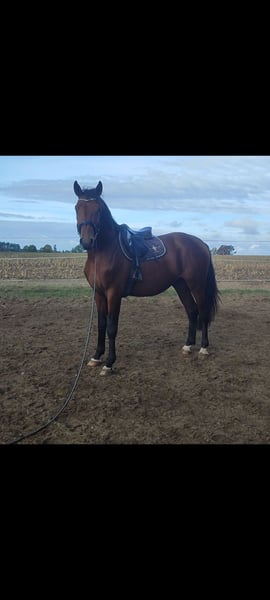 Three-year-old AES stallion Current height: 16.1 hh (approximately 167 cm, aiming for 16.3 hh / 170 cm) Light and agile in movement, flexible Ideal prospect for eventing, show jumping, and dressage Mixed dressage and jumping pedigree Sire: Floridos S Dam: Horizon His sire’s lineage includes renowned horses such as Nevados S and Concert. On the dam’s side, notable ancestors include Laurentio, Blue Hors Hotline, and Sandro Hit. This combination of bloodlines gives him a versatile talent, complemented by a wonderful temperament—"teddy bear" type. He loves human contact but can be somewhat dominant in the herd. Raised in a herd (geldings and stallions). Safe to handle and groom. Tied in a stable, accustomed to transport, lunged with saddle, and prepared for saddle work. On-site castration available. Located in the Greater Poland region near Piła. Contact phone: 500-085-223 Videos available on WhatsApp.