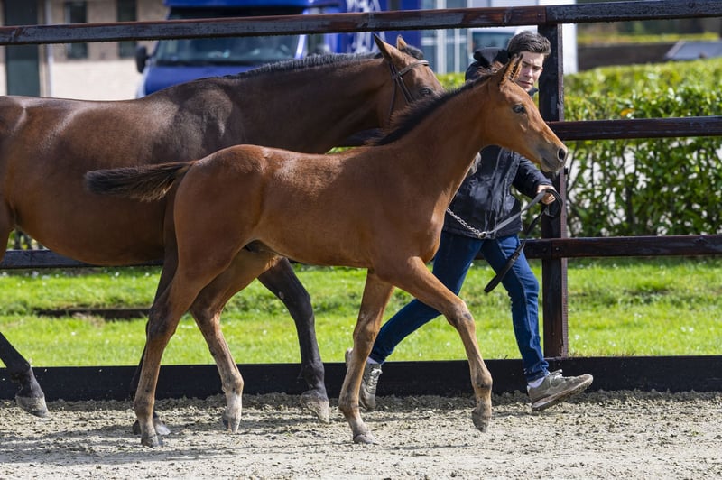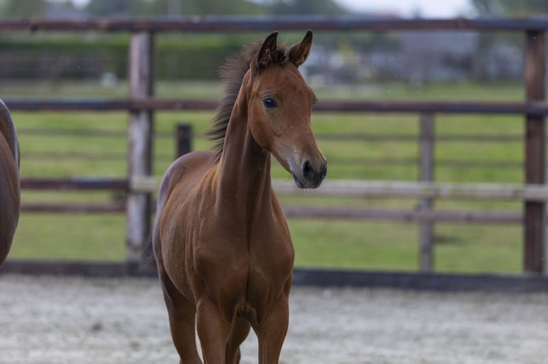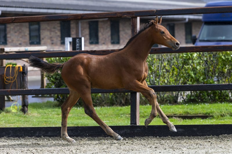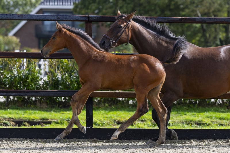 Dit hengstveulen liet thuis al zien waar zijn toekomst ligt: hij sprong spontaan over een hek in de weide. Als dat geen belofte voor de springsport is! Vagassa ‘A’ is een mooi naar boven gebouwd veulen met veel uitstraling. Hij beweegt lichtvoetig en toont het type dat straks comfortabel te rijden zal zijn. De trotse fokker leverde zelfs een video van deze sprong aan, die inmiddels ook online te bekijken is. Vader Pyke de Lis is pas vijf jaar, maar springt nu al op 1.25m niveau. Hij is een volle broer van Ansingh de Lis Z (1.40m) en Neeson de Lis (1.35m). Deze stammen uit de halfzus van de Grand Prix-paarden Uppie de Lis (1.60m) en Willink (1.60m) – beide succesvolle internationale toppers. Moeder Nagazza A is een dochter van de veelgevraagde Grand Prix-hengst Highway TN, winnaar van de Rolex Grand Prix in Den Bosch met Willem Greve. Grootmoeder Egazza (Wallenberg) voert op haar beurt de genen van de internationale sportmerrie Bagazza M (Quidam de Revel x Ramiro Z), die onder Dawid Kubiak (POL) actief was op 1.60m niveau. Met zulke prestaties van beide kanten van de pedigree is Vagassa ‘A’ een hengstveulen dat in de toekomst alle kansen heeft om zich te ontplooien tot een sportpaard voor het hoogste niveau.
