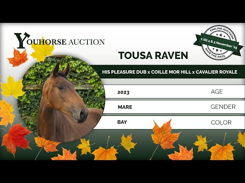De grootramige Tousa Raven is een interessant springpaard voor de toekomst. De tweejarige merrie laat nu al veel vermogen zien. Haar achtjarige vader His Pleasure Duborget heeft al elf (inter)nationale broers en zussen op 1.30m tot en met 1.50m niveau. Zijn moeder Ombre de Toscane is een halfzus van twee 1.60m Grand Prix-paarden, een op 1.55m niveau en een op 1.50m niveau. Moeder Loughnatousa Raven is een Ierse merrie die 1.60m Grand Prix sprong. Ze stamt af van de 1.60m Grand Prix-hengst Coille Mor Hill. Ze is een halfzus van Shannondale Linnet, die internationaal 1.40m sprong. Grootmoeder Flown (Imperius xx x King of Diamonds) bracht drie succesvolle eventingpaarden: Irish Moon (CCI3* niveau), Sir Donovan (CCI4*) en HHS Cooley (CCI4*). Zelf is Flown een halfzus van het 1.60m Grand Prix-paard Flo Jo.