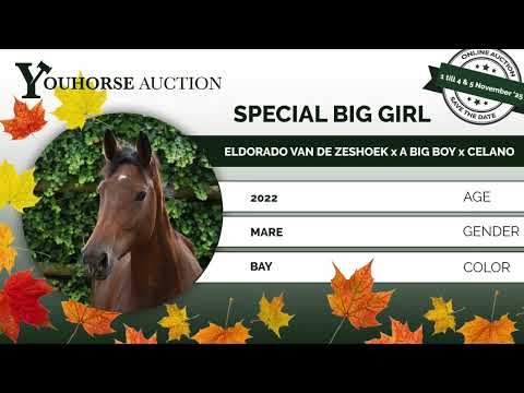 Build the fences up in the future, she already shows a lot of scope and wants to be careful. The three-year-old Special Big Girl does everything easily. This friendly mare is started under saddle. Sire Eldorado van de Zeshoek, performing at 1.60m Grand Prix level, produces fantastic showjumping horses. Famous offspring are for example Aachen and Calgary winner Killer Queen, Elektric Blue P, Jeunesse and the KWPN stallions Grandorado TN and Highway TN. Dam Big Girl descends from the Kannan son AD A Big Boy (1.60m Grand Prix). Granddam Valentina S carries the Grand Prix genes of Celano and Nimmerdor https://youhorse.auction/en/auction/Special-Big-Girl-ELDORADO-VAN-DE-ZESHOEK-TN-x-A-BIG-BOY