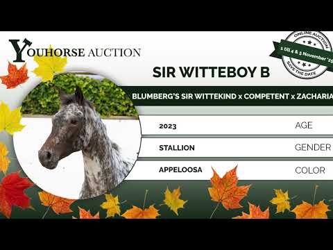 Appaloosa Sir Witteboy is a beautiful two-year-old stallion with good movement and a fantastic character. His striking colour comes from sire Blumberg’s Sir Wittekind, an eye-catching Appaloosa who jumped at 1.35m level and competed M1 dressage. Dam Chandall, a ZfdP mare by Competent x Zacharias, also gave the eight-year-old 1.45m level showjumping horse Dominator’s Doerthe with Dominic Gosert (GER). Chandall is a full sister to two 1.40m showjumping horses, one also classified at ZZ Zwaar (Advanced Medium level) and to two 1.30–1.35m level showjumping horses. https://youhorse.auction/en/auction/Sir-Witteboy-B-BLUMBERGS-SIR-WITTEKIND-x-COMPETENT