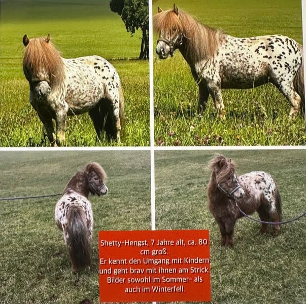 Shetty-Appaloosa-Hengst „Pumuckel“ – Kinderlieber Minipartner mit großem Herz Rasse: Shetlandpony Appaloosa Alter: 7 Jahre Stockmaß: ca. 80 cm Preis . 1200,- 0171-4001968 ✨ Beschreibung: „Pumuckel“ ist ein absolut liebenswerter und gutmütiger Shetty-Appaloosa-Hengst, der mit seinem freundlichen Wesen sofort begeistert. Er kennt den täglichen Umgang mit Kindern, lässt sich brav führen, putzen und ausgiebig betüddeln. Pumuckel ist sehr sozial, ruhig und nervenstark. Er kennt Hunde, Schafe, landwirtschaftliche Geräte und zeigt sich dabei stets gelassen – ein ideales Pony für Familien, Kinder oder als treuer Begleiter im Alltag. Ideal für: Familien, Kinder oder Ponyfreunde, die einen verlässlichen, freundlichen kleinen Partner suchen, der geduldig und ausgeglichen ist. Unsere Pferde werden regelmäßig: – entwurmt – vom Schmied betreut – osteopathisch kontrolliert