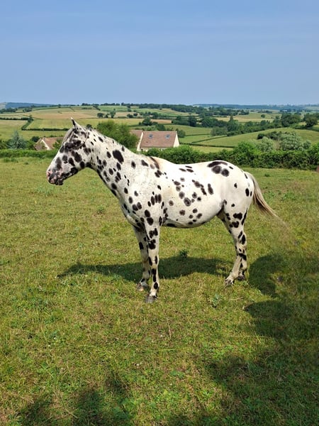Dsr Bluhawks Rocky, petit cheval de race appaloosa fondation PP vous est proposé au Haras de Blignys à CERSOT (71) en monte en main. Il sera également proposé à compter d'avril 2026 en IAC dans toute la France et UE. Rocky toise actuellement 1,47 cm. Il est également homozygote sur le black et le PATN1 et possède un gène crème. Il vit depuis son tout jeune âge en troupeau avec des congénères du même sexe. Au quotidien, c'est un cheval calme mais réactif, proche de l'homme, sociable, joueur, facile aux soins, généreux et volontaire. Pas encore débourré, il sort en main en extérieur ou en carrière. En liberté, il présente un joli coup de saut sur les barres. Il possède également un très bonne génétique (lignées Tobys, Pratt et Ulrich)héritées des ses parents. Son débourrage est prévu pour l'automne 2026. Il devrait également sortir sur quelques compétions (en discussion). Encore jeune, 2025 a été sa première année de saillie et attendons son premier poulain courant juillet 2026. Vous rechercher un cheval de petite taille, pour le loisir ou la compétition ou tout simplement pour de l'élevage, Rocky est fait pour vous. Etalon à jour des tests sanitaires et vaccins (grippe - rhino) avant le début de la saison. Juments calmes et éduquées, déferrées des postérieurs, à jours sanitairement, test négatifs métrite, artérite et anémie. Saillies en main : APHC, QH : 500 euros OC : 400 euros Saillies en IAC : APHC ou QH : 650 euros Contrat de saillie et pension obligatoire. Possibilité de laisser la jument en pension élevage sur place. Pour tout renseignement, vous pouvez me contacter. Mon site internet : https://mldemar36.wixsite.com/appaloosa-fondatio-1