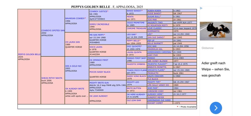 **Annonce de vente : Jument Appaloosa** À vendre, une magnifique jument Appaloosa, née en 2025. Avec une taille au garrot de 152 cm, elle est la partenaire idéale pour les cavaliers western à la recherche d'un cheval polyvalent et au caractère fort. Cette jument se distingue par sa nature amicale et sa volonté d'apprendre. Elle est bien éduquée et souhaite toujours faire plaisir. Son pelage remarquable en fait un véritable attrait. Elle convient aussi bien pour les loisirs que pour les compétitions et est bien sûr très intéressante pour l'élevage. Pour toute question ou pour plus d'informations, je suis à votre disposition. Plaudit San Molly (LG 1 primée) Environ 152 cm au garrot Père : Cowboys Spoted San Mère : Charmys Purple Rose Couleur : Alezan / blanc Peppys Golden Belle (LG 2 primée) Environ 158 cm Père : Cowboys Spoted San Mère : Sheza Mithy Nikita Couleur : Buckskin Les deux poulains sont négatifs aux 5 panels par les parents. Prix par poulain !!! Envoyez-moi simplement un message !