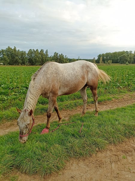 A very gentle and calm Appaloosa mare. She has a sweet character when interacting with people and does not display mare-like behavior within the herd. She is well-behaved and calm on outdoor rides. She has an aptitude for cutting and also enjoys groundwork sessions. She possesses ground skills under saddle. If genuinely interested, more information can be provided.