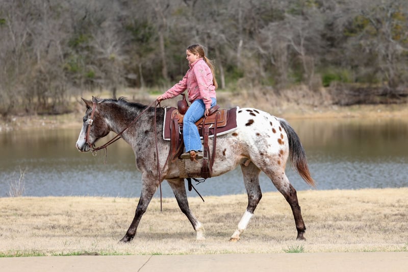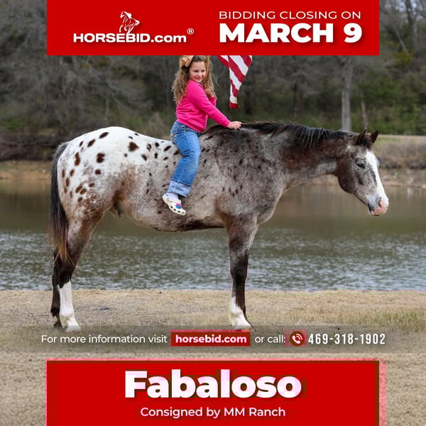 ℳ𝒶𝓇𝒸𝒽 ♦️𝐑𝐈𝐃𝐄𝐑'𝐒 𝐂𝐇𝐎𝐈𝐂𝐄♦️ Happening now thru MONDAY | MARCH 9th - Available EXCLUSIVELY on HorseBid's website! For more details and to register visit: www.Horsebid.com CONSIGNOR CONTACT: MM Ranch 469-318-1902 LOCATION: Forney, TX BREED: Appaloosa REGISTERED: No REGISTERED NAME: Fabaloso COLOR: Appaloosa HEIGHT: 15.1 AGE: 13 GENDER: Gelding Fabaloso aka the Fabulous Appaloosa!!! Yes also named after the best smelling floor cleaner ever. Fabaloso is a 13 year old (verified by a vet) and 15.1 hands tall blanketed Appaloosa. In my opinion a very unique looking and very pretty Appaloosa. But I’m very partial to him! Fabaloso is absolutely gentle kind soul that would be the most ideal horse for first time horse owners. He is so unbelievably kind, soft eyed, straight to the point, no nonsense type of gelding. The kind that is reliable, steady, and seasoned. He is a been there done that type because he has literally been there and done everything. He has been ridden across mountain ranges, hunted off of, and has packed gear through the great backcountry. He crosses water, logs, bridges, brush, and terrain of every kind like he's done it a thousand time. Where most horses spook or hesitate around traffic, busy roads, trains, crowds of people, Fabaloso doesn't even blink an eye at it. 🚂 We took him to town and watched the train pass, he stood right bedside it and wasn't bothered by it with a 6 yr old on his back. How many horses do you know will do that?!?! Have you ever stood beside a moving train? I’m talking like 5 ft from it and felt the wind rushing by you and heard the loud noses it makes. It will make your heart race even as a human. He rode right next to out with a very timid little 6 yr old on his back. Absolutely didn’t even faze him at all. 🚂 This gelding is as solid in town as he is on the trails. Ride him right down the street with cars buzzing past, trucks rolling by, and everyday commotion with confidence knowing he will not spook. He's been down Main Street, through neighborhoods, and into busy areas without a single worry. Fabaloso is fun and easy to ride. That old fashioned broke type. You can ride him with a string around his neck. He is light and responsive. Absolutely does everything you ask him to do without hesitation. Fabaloso is an in-your-pocket, meet-you-at-the-gate kind of gelding. He's soft, gentle, and genuinely enjoys people. You can saddle him cold, saddle him warm, saddle him after time off—he stays the same, broke and honest. Rides bareback. He rides in a halter, hackamore, or bit, it doesn't matter to him. Even if you are a complete beginner, you can ride him and enjoy him. Absolutely safe with no bad habits whatsoever. I can't say that enough. It doesn't matter if you have never owned a horse before. You can learn on this one. You can build your confidence. But if you are an advanced rider looking for safe you can enjoy him too. Stall him or turn him out-either way, he's content and an easy keeper. Fabaloso is the full package with the kind of temperament people spend years searching for. If you want a bombproof gelding that the whole family can ride, in the mountains, on the streets, work the ranch, and babysit the kids, one that you know without a shadow of a doubt that they are safe —this is the one. Horses with this kind of experience and mileage don't come up for grabs often. Fabaloso is a very easy keeper. Requires no maintenance of any kind. He can go bare foot or put shoes on him. He sells 100% sounds with no issues. He did have a pre vet evaluation done included in the pictures. If you have anymore questions about him feel free to call. We would love to visit with you about him. We can help you arrange fast affordable shipping anywhere. He is up to date on all vaccinations, worming, had his teeth checked, feet. He is ready to go to his new home.
