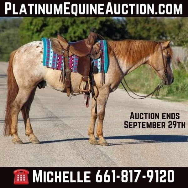 ONLINE AUCTION Place your bids at www.PlatinumEquineAuction.com Starting Bid $3500 Auction ends September 29th, 2024 Need a new saddle? Check out White Rock Saddles on our website or Facebook! Juicebox is an amazing once in a lifetime pony !! And gorgeous to boot! He is the prime age of 13 years old and standing 13.2 hds tall . He is a flashy red dun appaloosa gelding . If you looked up the definition of a true all around pony his name would pop up every time. There isn’t anything he hasn’t seen or done . Juicebox rides english and western , has done ranch work , roped the breakaway dummy on , runs the barrels and poles , has jumped small cross rail jumps , and goes down the trail like a seasoned veteran every time . He is one that the WHOLE family can enjoy and be absolutely safe on . He’s big enough for even the adults to ride and have fun on. Juicebox has had a TON of training which makes him the fancy riding pony he is . Absolutely nothing bothers this guy at all . Take him out to check the cattle and fences on . He has been rode on all kinds of trails including right down the busy bricks of Exchange Ave at the world renowned Fort Worth Stockyards with traffic , crowds of people , horse carriages, longhorns , loud music and plenty of other distractions. He’s always a town favorite getting all the attention because he’s absolutely perfect ! Juicebox has seen many nights of over night camping trips in the mountains, he’s been down miles and miles of trails at the National Parks from rough steep terrain to the flat grasslands he handles it all with ease all while keeping his rider safe . He will ride right into the river every time with zero hesitation, he will cross bridges and logs. In the arena he’s just as perfect he neck reins the very best , he breaks at the poll, he will walk, trot and lope beautiful circles all day long . He’s absolutely a kids dream pony to take to the 4H shows or even do the drill team on or go to the jr rodeos, he packs a flag with no issues at all. Ones like Juicebox are hard to come by and you will drive the wheels off your truck searching for one like him, he’s that once in a lifetime unicorn that you don’t want to miss . He is perfect for any level rider including the brand new beginner horse lover. His size is absolutely perfect for the smaller kids and does not intimidate them. He stands like a perfect gentleman for bathes , easy to tack up and bridle. He stands to be clipped and groomed, loads in and out of the trailer. Juicebox is the sweetest boy that’s always in your pocket loving all the attention and cookies. Contact us to come try him, or we can set up a FaceTime also. If you need help with transport don’t hesitate to ask we have a list of reputable haulers that can get him safely to your doorstep world wide. Located in Stephenville, TX. Contact M $ Performance Horses Michelle 661-817-9120. ONLINE AUCTION Place your bids at www.PlatinumEquineAuction.com Starting Bid $3500 Auction ends September 29th, 2024 Need a new saddle? Check out White Rock Saddles on our website or Facebook!