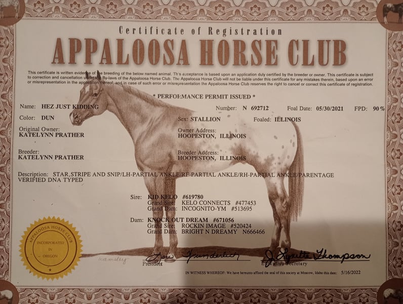For Sale: Beautiful 2021 Appaloosa Gelding Gunner (Hez Just Kidding) Is a 2021 (4 year old) registered Dun appaloosa Gelding. He stands at 15.3. He has extremely good bloodlines his Sire is Kid Kelo and his Grand Sires are Kelo Connects and Rockin Image (Pictured). Was showed a lot when he was 2 but hasn't been since. I have done some training with him and I did ride him quit a bit In the Summer then I got busy and haven't done much riding since. He learns extremely easy and is incredibly smart. He is a super sweet horse and loves people. Never have had any problems with him kicking, biting, catching him or loading him. He bucked when I rode him for one of the first times but hasn't bucked since. He is definitely ridable but definitely needs work. I grew up with horses and he is by far the smartest horse we have ever owned. I would definitely keep him but I can't give him the time he deserves. He would make someone an excellent horse. Located in LaOtto,IN (near Fort Wayne). For price and more information please feel free to call or text me at 260-318-2857 or you can PM me.