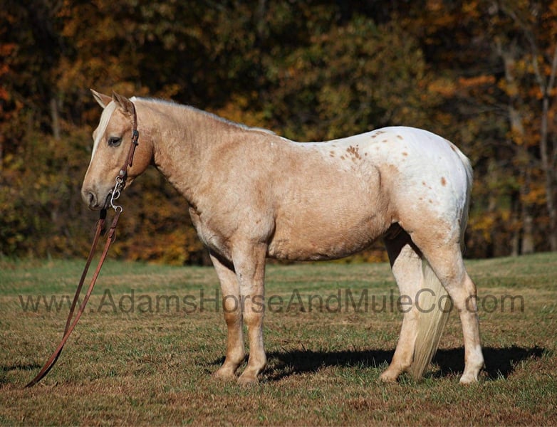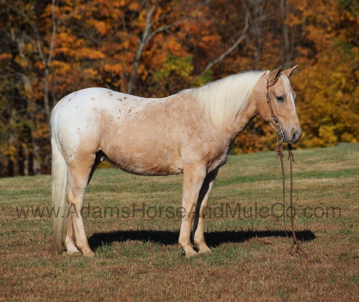 Go to visit our website for more pics and a video. AHAMC has been in the horse business and sold horses over the internet since 2005. We have a long track record of success with hundreds of happy customers. We work hard to match riders with the correct horses and specialize in beginner safe, family friendly horses that have been used and checked out by our family! Trash those X-Boxes, Playstations or other video game consoles, kids don’t need to be glued to a TV… Kids need a horse like Pecos Bill!!! Take a look at the coolest little appaloosa horse that you will see! He has it all going for him from that beautiful palomino color, to that pretty LONG mane and tail and don’t forget about that sweet little lope! Pecos Bill is a 5 year old gelding that is standing around 13.3hh. All fall and winter long Pecos Bill has been one of our 6 year old daughters horse and she has trail ridden him, took him camping, had around the ranch and pushed cows with him. Pecos Bill has been the perfect horse for her! Pecos Bill is plenty stout enough to carry an adult as Mom has taken Pecos Bill out on the ranch, where she has pasture roped and doctored sick ones, herded cattle and the kids have ridden down the trails almost daily! Pecos Bill will cross creeks, ditches, logs and navigate rough rocky areas. He has a nice walk, smooth jog, a good slow lope, he reins around and backs as well! He has been exposed to all kinds of wildlife and will go anywhere that he is asked too. He has been ridden many miles in the mountains of Eastern Kentucky and encountered every obstacle possible on the trail. He will go up or down even the steepest slopes, across deep creeks, over downed trees, and over all types of rough terrain while still being sure footed. Pecos Bill will be a family favorite for years to come! Call 606-308-2461 for more info.
