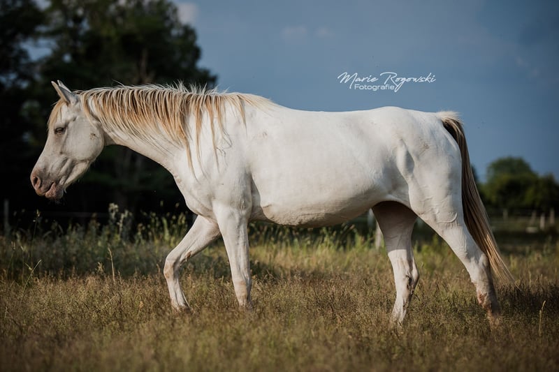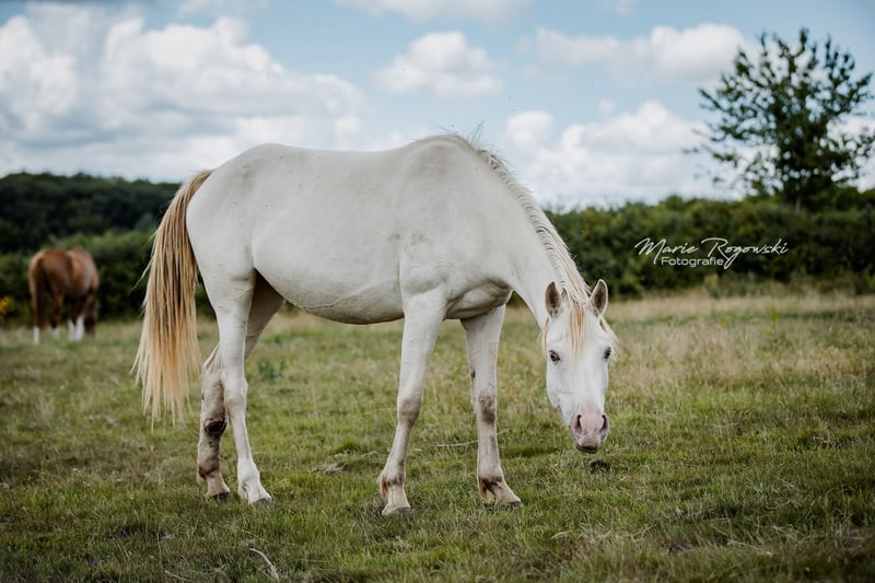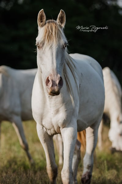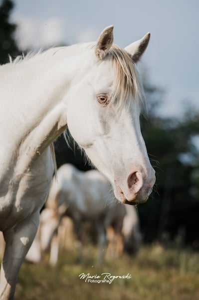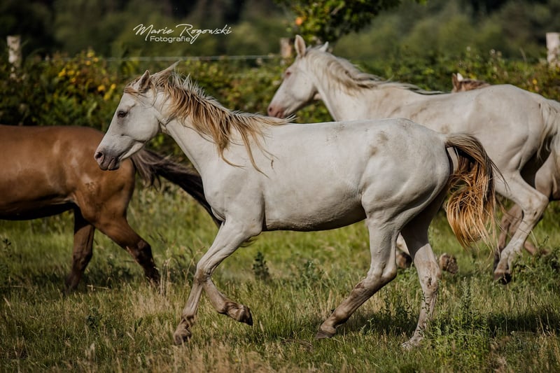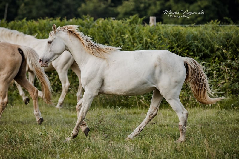 Deutsches Reitpferd | geb. 2020 | Cream Champagne KHREME DE COCO vereint auffällige Farbgenetik mit einem sportlich-eleganten Erscheinungsbild. Als Tochter des gekörten Vollblut-Hengstes TCF Palladium und der Amber Champagne-Stute Khreme Kharamel GF trägt die seltene Farbe Cream-Champagne (also sowohl Cream als auch Champagne Aufhellungsgen vorhanden), das sie zu einem Blickfang in jeder Herde macht. Khreme de Coco hatte eine Verletzung am Hinterbein, die sorgfältige Pflege und Beobachtung erfordert hat. Sie läuft derzeit klar, zeigt keine Schmerzreaktionen und bewegt sich unauffällig. Es ist jedoch davon auszugehen, dass ein bleibender äußerlicher Makel zurückbleiben wird, der ihre Nutzung in Zucht oder Freizeit nicht zwingend einschränkt, aber hier trotzdem erwähnt werden soll.