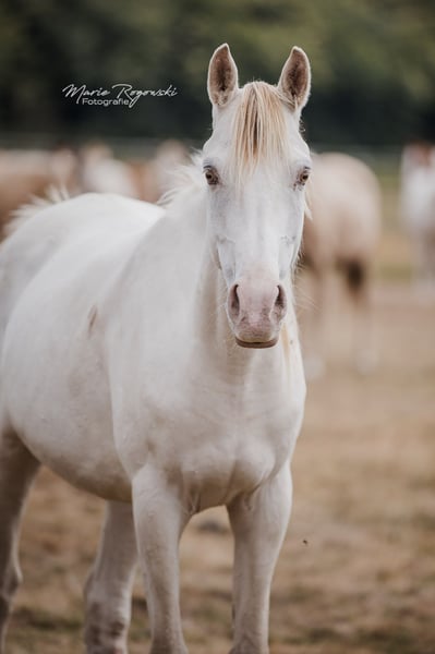 Cheval de selle allemand | né en 2020 | Cream Champagne KHREME DE COCO allie une génétique de couleur remarquable à une apparence sportive et élégante. Fille de l'étalon pur-sang approuvé TCF Palladium et de la jument Amber Champagne Khreme Kharamel GF, elle arbore la rare couleur crème champagne (présence des gènes crème et champagne), qui fait d'elle une véritable attraction dans n'importe quel troupeau. Khreme de Coco a subi une blessure à la patte arrière qui a nécessité des soins et une surveillance attentifs. Elle court actuellement sans difficulté, ne montre aucun signe de douleur et se déplace normalement. Il faut toutefois s'attendre à ce qu'il lui reste une marque extérieure permanente qui, sans limiter nécessairement son utilisation dans l'élevage ou les loisirs, mérite néanmoins d'être mentionnée ici.