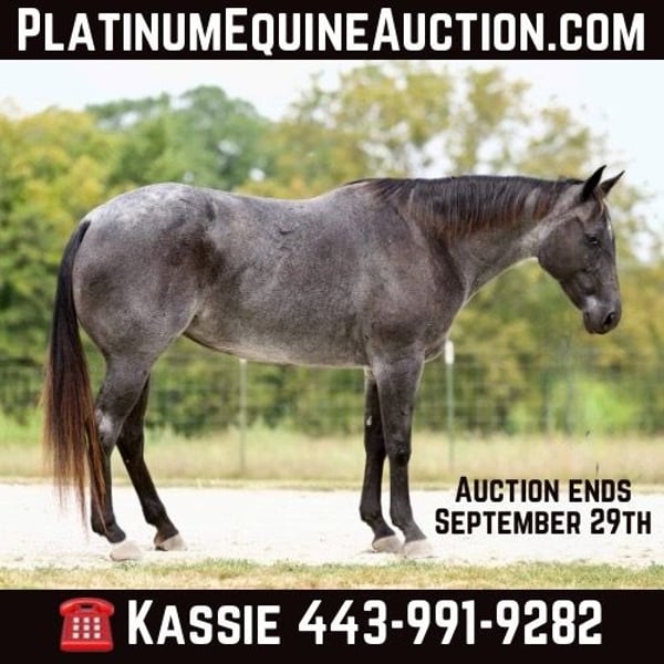 ONLINE AUCTION Place your bids at www.PlatinumEquineAuction.com Starting Bid $3500 Auction ends September 29th, 2024 Need a new saddle? Check out White Rock Saddles on our website or Facebook! Barbie is 9 year old blue roan mare that stands at 15.3 hands and is a solid, well-built horse with a stocky, muscular frame. Her blue roan coloring turns heads everywhere we go, and her gentle demeanor makes her a pleasure to be around. Barbie has been extensively trail ridden, her calm nature offers more “woah” than “go,” making her an ideal mount for riders looking for a steady, easy-going trail partner. In addition Barbie has also been used to gather and check cattle along with fence lines. This girl is an all-around good fit for someone looking for a reliable horse that can either continue to hit the trails or be used in a lesson program. She stands quietly to be bathed, groomed, clipped, and shod!! For more information please text or call Kassie Long 443-991-9282 Located in Marshall, MO. ONLINE AUCTION Place your bids at www.PlatinumEquineAuction.com Starting Bid $3500 Auction ends September 29th, 2024 Need a new saddle? Check out White Rock Saddles on our website or Facebook!