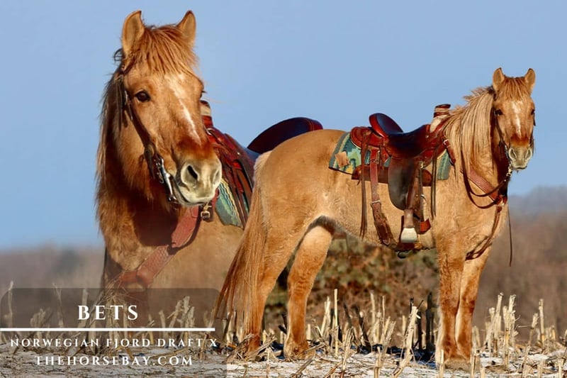 Bets is a coming 4yr old red dun Fjord Draft Cross mare standing at 15.1 hands tall and very stout. Her dad is a registered Fjord and her mom was a Percheron cross. And we purchased Bets straight from the breeder so there are no unknowns with her. You get her full story. Bets really takes after the Fjord side and is a good example of the breed. She is stout and strong, but NOT klutzy or lazy. She is NOT a hot horse of course she’s more whoa than go, but she can move out when asked and she’s agile. So, she’s not a typical draft type of horse that’s lazy or klutzy. When I ride her, I feel like I’m riding a nice heavy duty four-wheeler. That’s the best way I can think to put it. She is a veritable trail MACHINE! She will go ANYWHERE I point her. She has NO fear of water whatsoever. In the video you’ll see her go in the river. What you don’t know is the first time I took her in the river she was ready to go swim across it. But being its winter, I didn’t want to go for a swim. So anyways she loves the water she will go trotting right in it. She’s ready to swim a river for you anytime. She is like a fish in the water. She’ll also cross huge logs, and little wooden bridges. She’ll hop right up the steep banks and pick her way down a steep hill carefully. She is a regular powerhouse. She is drafty, but fun. I personally can’t stand a lazy/klutzy draft. So, she is so much more fun because she has the power of a draft, but the agility of a quarter horse. And she’s stout without being overly tall to get on so she can carry a heavier rider and it’s a lot easier to mount from the ground. She has a very nice canter and a smooth trot. She has this little jog trot she’ll do that is easy to sit to. She will leave home alone just fine. She can lead or follow out on the trail and will separate from the other horse. She stands stock still for mounting, she loads right in and backs right out of a trailer, and good for getting her feet trimmed. She is middle of the pecking order. And an easy keeper. She knows how to move her shoulders and hindquarters off the leg. And she also will neck or direct rein. She’s good with traffic coming from in front or behind her. I could easily see her becoming a beginner type horse in a year if someone keeps her going the right way. She’s a smart horse with a willing attitude and remembers everything you teach her you don’t have to show her multiple times She comes up to date on vaccines, dewormings, coggins, and vet check. Just call to set up a time to come see her or if you have any questions.