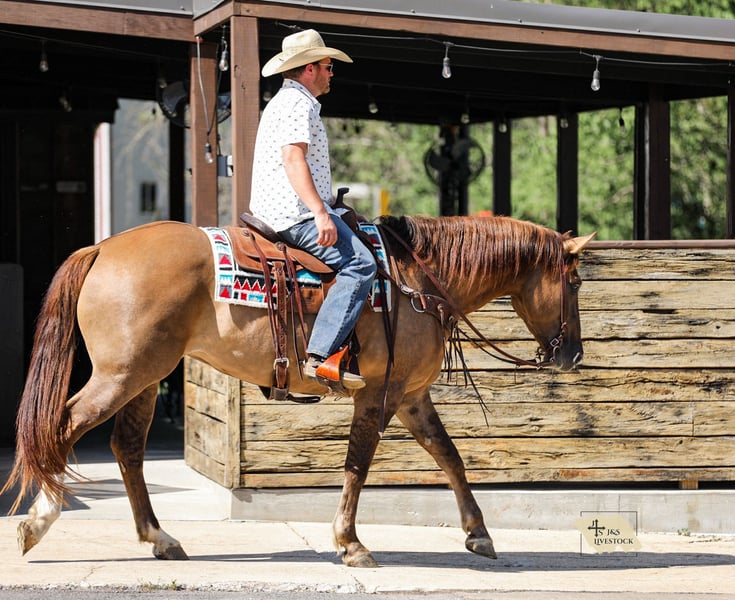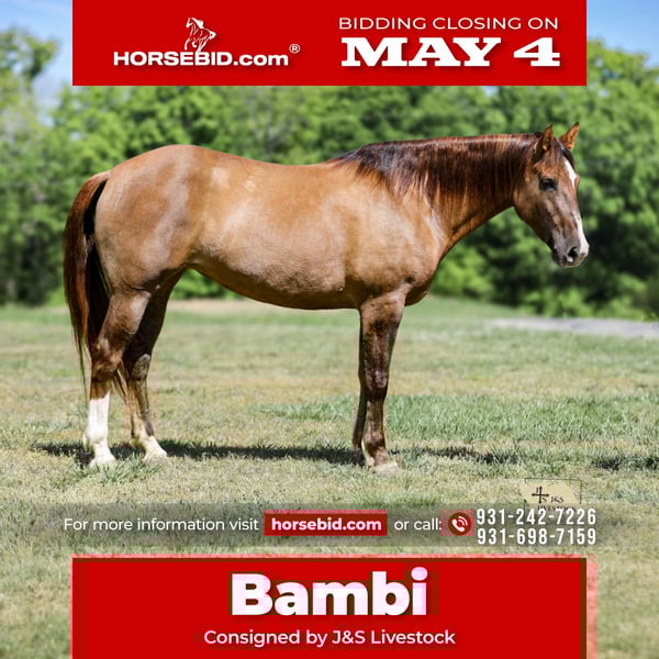 ▪️▫️◾️𝐭𝐡𝐞 𝑴𝒂𝒚 𝐒𝐞𝐥𝐞𝐜𝐭◾️▫️▪️ Happening now thru MONDAY | MAY 4th - Available EXCLUSIVELY on HorseBid's website! For more details and to register visit: www.Horsebid.com CONSIGNOR CONTACT: J&S Livestock 931-242-7226 or 931-698-7159 LOCATION: Santa Fe, TN BREED: Draftcross REGISTERED: No REGISTERED NAME: Bambi COLOR: Dun HEIGHT: 16 AGE: 6 GENDER: Mare Bambi is a 6yr old, 16hh draft-cross mare that will be the gentlest soul you could ever want. This gal is big, stout, and absolutely stunning and has the kindest, sweetest personality you could ask for with such a solid foundation. She is built correct with perfect confirmation, surefooted as any, and most of all will be SAFE for nearly anyone. This mare has been a personal favorite for myself and my husband. She has been a solid go-to when any sort of ranchwork needs done, if the weather is tough, or if you just need an easy mount to go out and enjoy a peaceful evening on. For a draft-cross, Bambi rides like a 14.3h horse. She is smooth, has perfect transitions, and a nice trot with an even better lope that feels like you’re floating on a cloud. This gal has plenty of real life experience- from ranch work, camping trips, to even some light English use. With that be said, a favorite of mine is how easily Bambi adapts to new situations. No matter what you ask of her she always does it with a very mature attitude, and takes to it nice and slow- never rushing the process of learning something new. Without hesitation she will safely cross deep water, logs, and sketchy terrain. She isn’t afraid of wildlife, dogs, cattle, or loud farm machinery that always seems to be roaring around our place. She is confident with only the company of her rider, so riding out alone is a breeze. She will also side pass over to her rider for easy mounting whether you’re on a mounting block, trailer fender, or whatever you can find that works for you. Bambi loves a bath, is good for the farrier, and tacks up with ease. She loads in and out of a trailer like a pro, and stands tied quietly no matter what. I truly feel Bambi would make an excellent family style horse. Aside from her gentle demeanor, she has the brains and level of capability to excel in anything she does- keep her working cattle out on the ranch, take her into an English setting, or make her one fancy trail horse. With no hesitation she can handle a long days work out in the open and she will stay fluent and confident- she is the definition of dependable, she will never give up on you or let you down. However, she doesn’t require a long days work, you can go tack her and head out for a couple hours and she will always be the same horse. Bambi does good turned out or stalled. She is a very easy keeper and requires ZERO maintenance. Overall this is true once in a lifetime horse that is GENTLE, and stays gentle. I feel confident anyone would love and enjoy her as much as we have! Bambi has a recent PPE and is 100% sound and sane. For any further information please don’t hesitate to reach out- Bailey 931-242-7226 or JT 931-698-7159